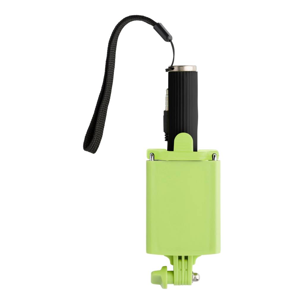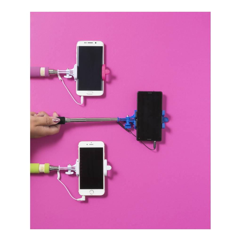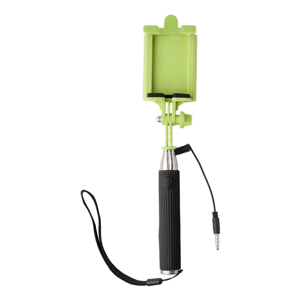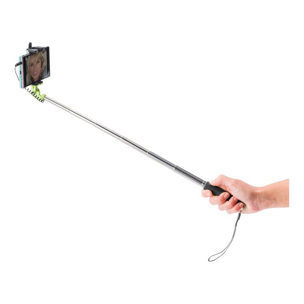 ABS telescopic selfie stick, expandable to a maximum length of 61 cm. Including selfie shutter button on the handle and cable with plug, approx. 26 cm long.
