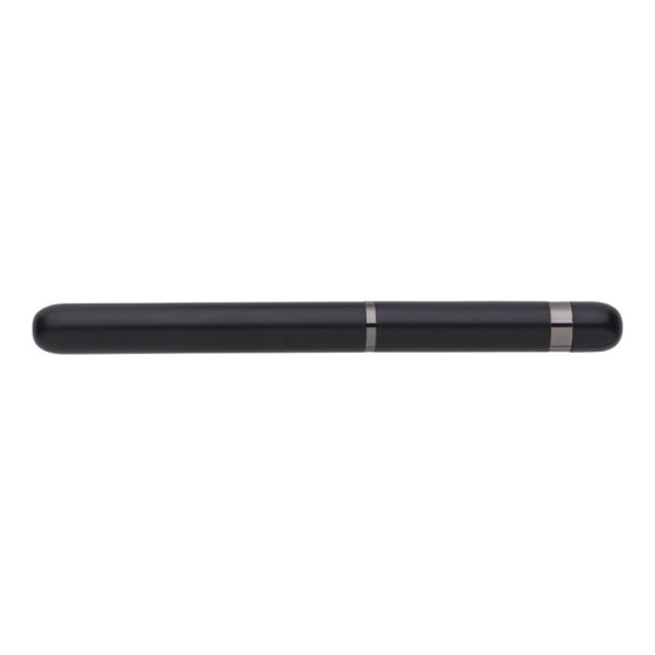 Aluminium and brass ballpen. With shiny details on the clip, ring, and push button. Blue ink. Individually packaged in magnetic giftbox with paper sleeve.