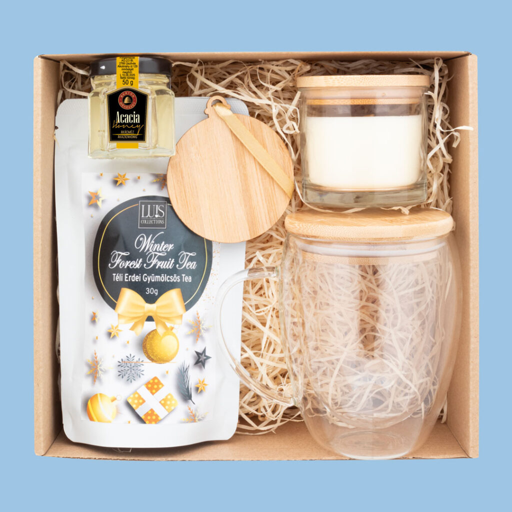 Travel gift set in kraft cardboard gift box with wood wool filling and red ribbon. Including: “Kayla” RPET polar blanket; “Makalu” vacuum flask; “Luis” Costa Rica coffee (40 g); “Floq” artisan cantuccini (100g); “Jerpstad” Christmas tree ornament.