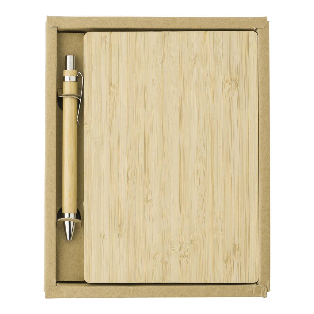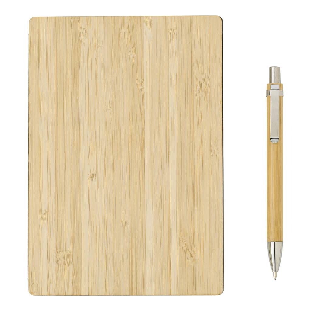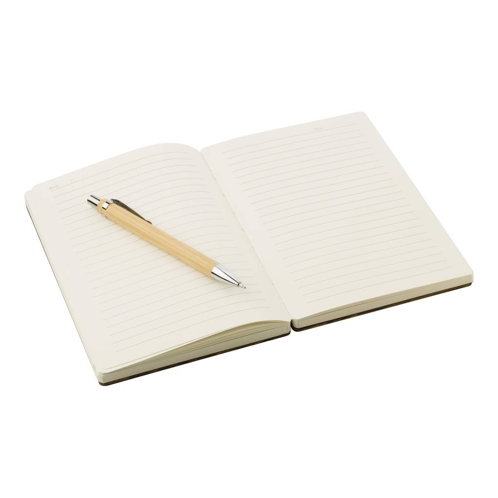 Bamboo cover notebook, packaged in a brown craft paper box. Including bamboo pen 3804. The notebook had 128 sheets of lined paper with date notification.