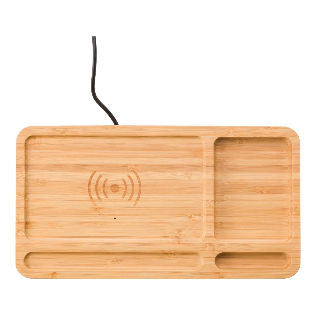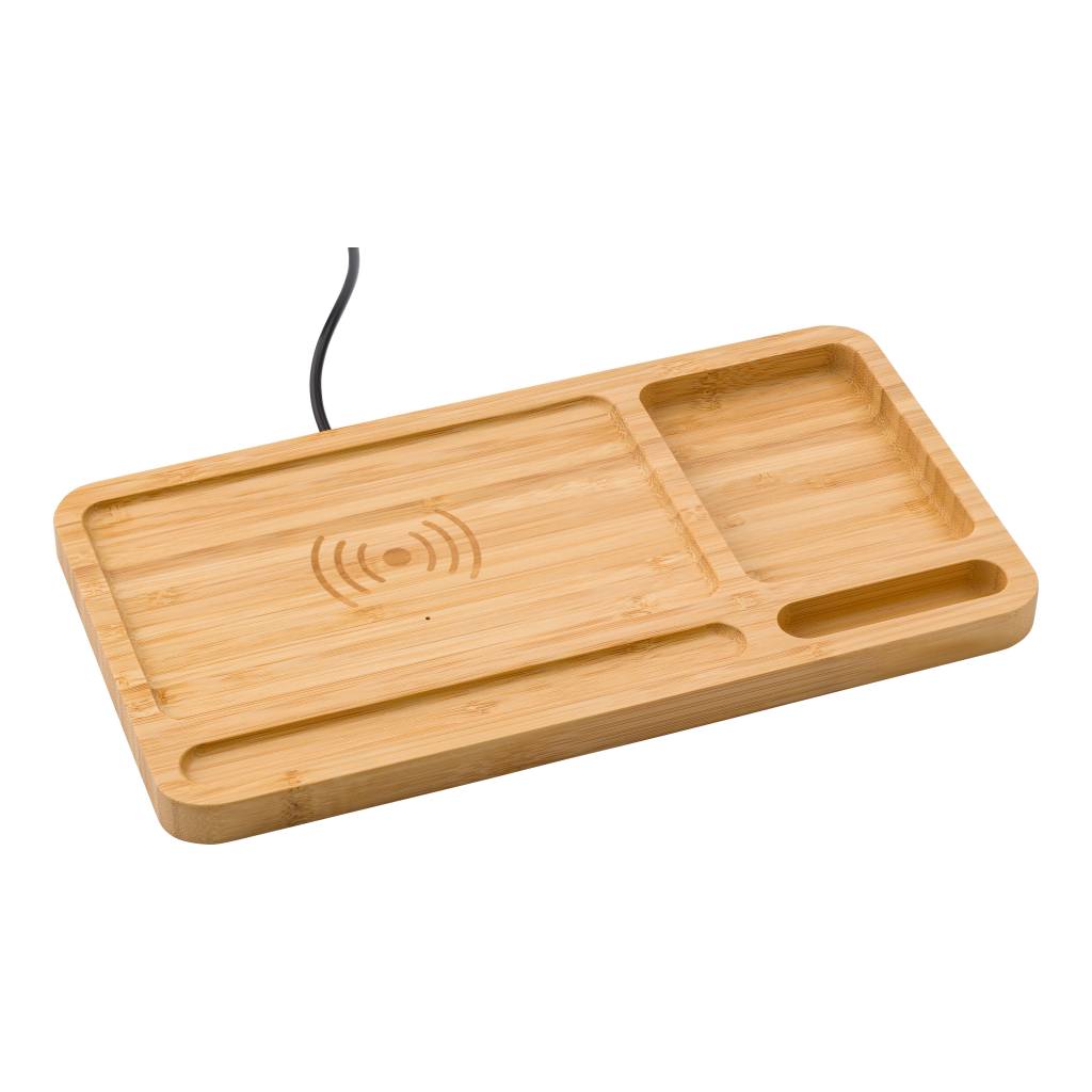 Bamboo desk organizer with wireless charging function (5W). Output 5V/800mA. Includes USB charging cable.