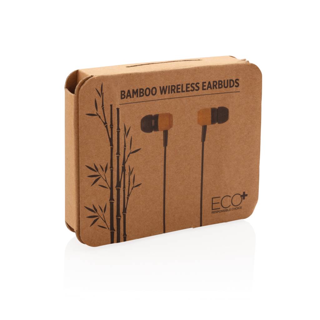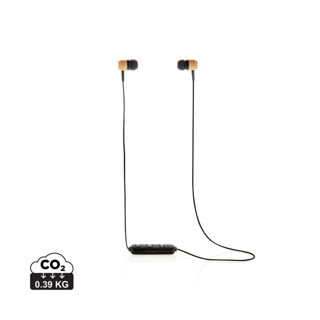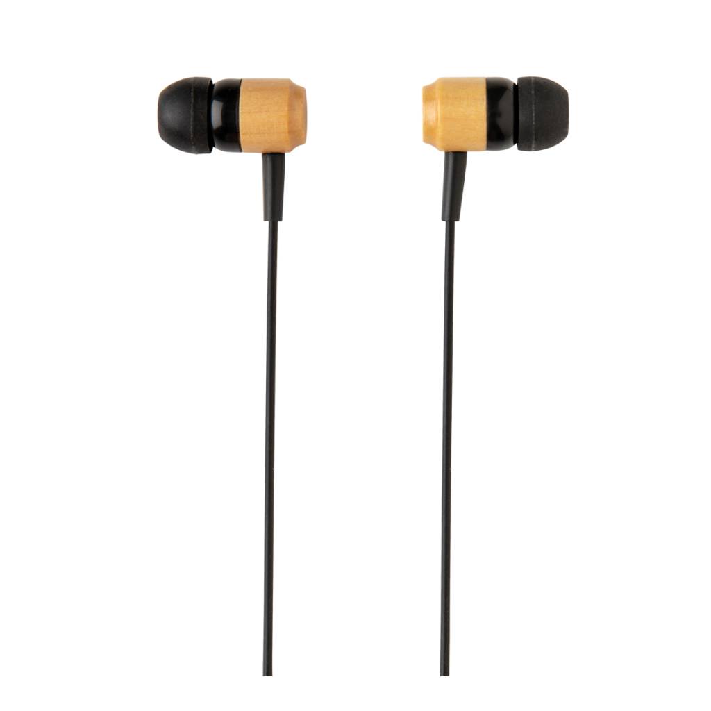 Eco wireless earbuds packed in ECO pouch. The bamboo earbuds fit perfectly to listen to your favorite music in a sustainable way. The earbuds have magnetic ends to join them together when not using. With 55 mAh battery that allows a play time up to 3 hours and re-charging in 1 hour. With BT 5.0 for smooth connection and operating distance up 10 metres. Includes 3 size ear tips.