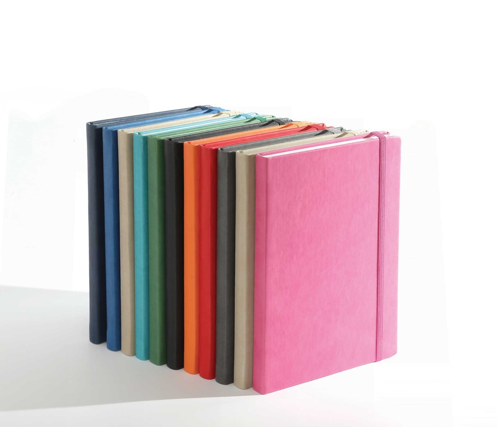 Scope: A5 ~14 x 21 cm / Pages: 192 / Paper type: 80 g/m² sheets / Print: One color / Binding: Sewn, capital ribbon, elastic band, bookmark ribbon / Covers: PU canvas (thermosensitive cover) / Recommended printing methods: Silkscreen, foil stamping, thermal printing, UV printing