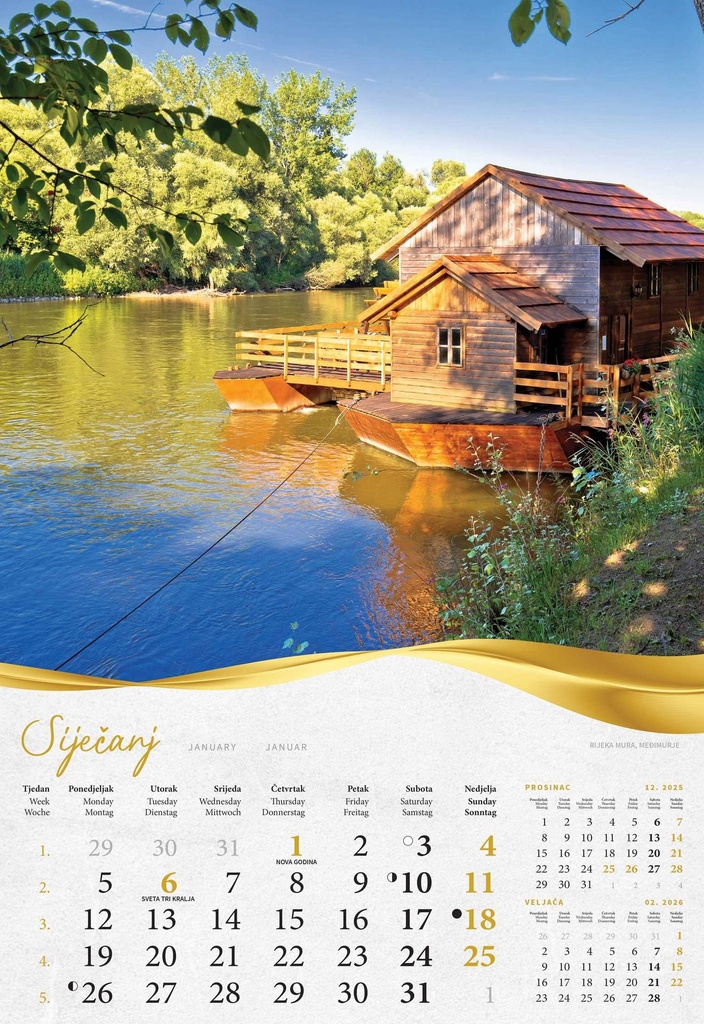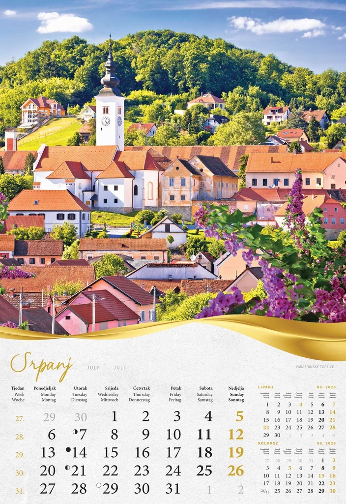 Scope: 13 sheets / Dimensions: 33 x 55 cm / Space for printing: 33 x 7 cm / Description: Quarterly calendar, bag / Languages: HR, GB, DE / Paper type: KD 150 g/m² sheets, 350 g/m² base / Binding: Spiral / Packaging: 40 pcs