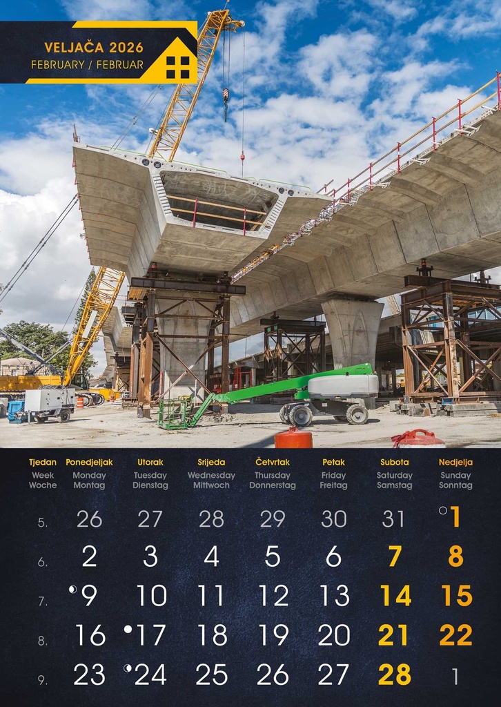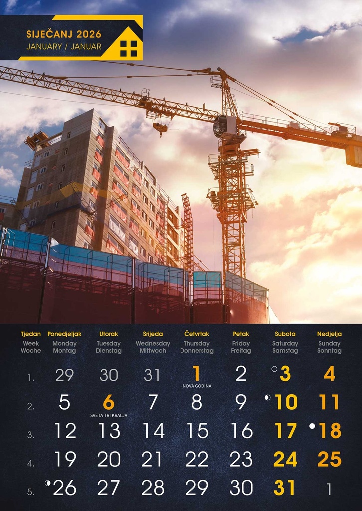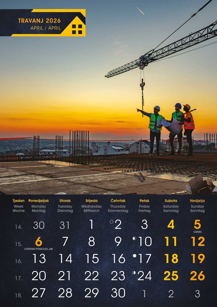 Scope: 13 sheets / Dimensions: 30.5 x 50 cm / Space for printing: 30.5 x 7 cm / Description: Quarterly calendar, bag / Languages: HR, GB, DE / Paper type: KD 135 g/m² sheets, 350 g/m² base / Binding: Spiral / Packaging: 50 pcs
