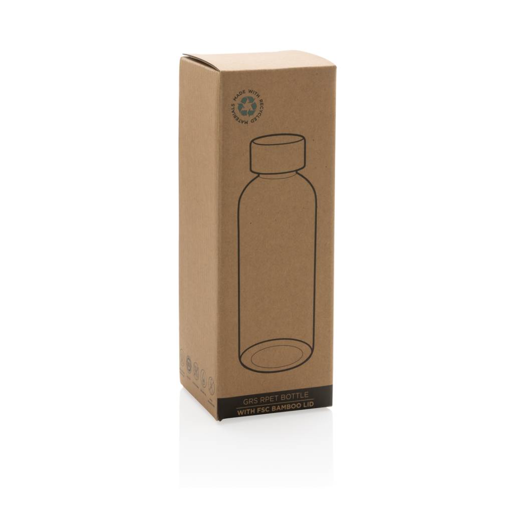 This RPET water bottle is single-wall constructed and features a stylish FSC-certified bamboo lid. The body of the bottle is made from 100% RCS certified RPET. RCS certification ensures a completely certified supply chain of the recycled materials. Hand wash only. This product is for cold drinks only. Total recycled content: 75% based on total item weight. BPA free. Capacity 660ml. Including FSC®-certified kraft packaging.