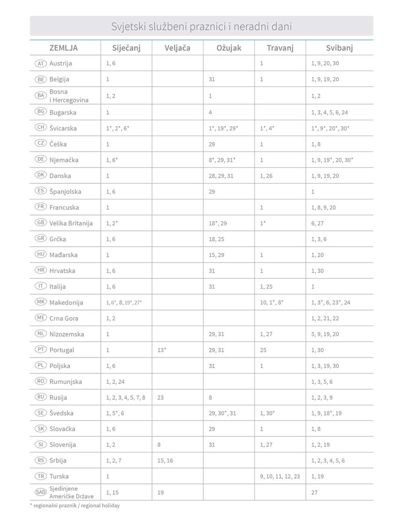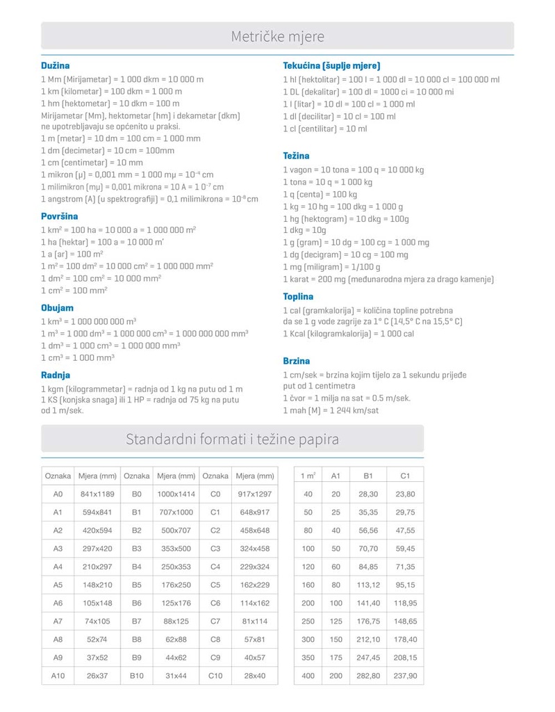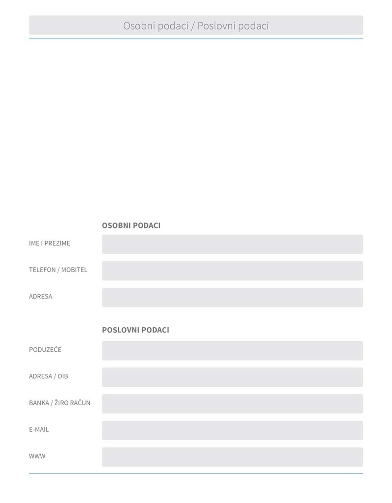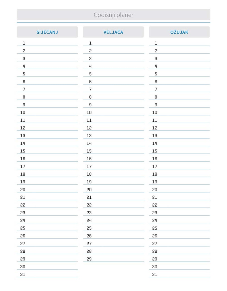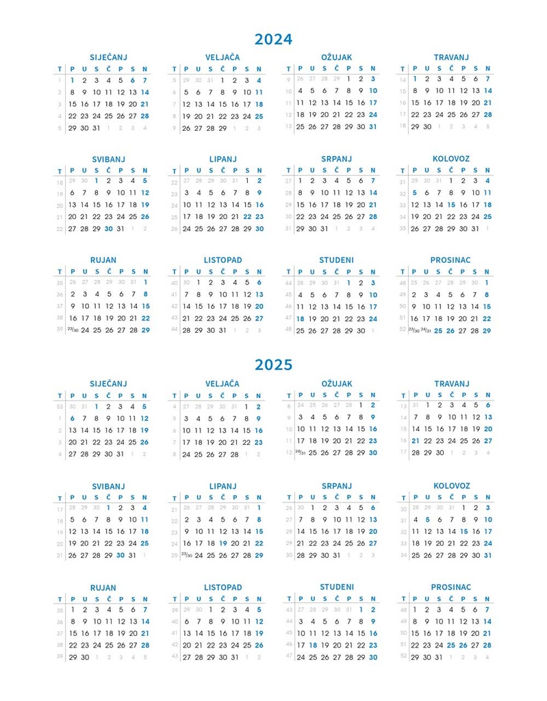 Scope: 192 pages / Dimensions: ~19.5 x 26 cm / Languages: HR / Paper type: 80 g/m² sheets / Print: Two colors / Binding: Sewn, headband, ribbon marker / Recommended printing methods: Foil stamping, thermal printing, UV printing / Content: The first part contains basic information, a 4-year calendar, a monthly planner, time zones, distances between major European cities, and metric measures. The second part includes notes.