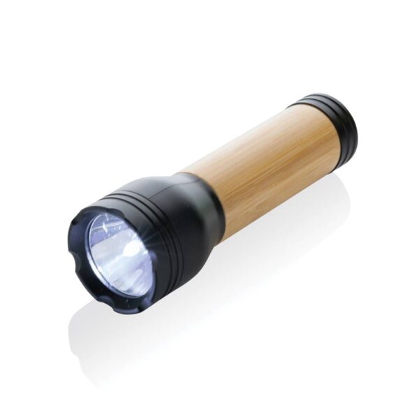 USB rechargeable 5W torch made with FSC® 100% bamboo and RCS (Recycled Claim Standard) certified recycled ABS. Total recycled content: 18% based on total item weight. RCS certification ensures a completely certified supply chain of the recycled materials. The torch comes with 1800 mah grade-A lithium battery. The torch can be operated up to 6 hours on one single charge and recharged via type c in 5 hours. The beam distance is 150 metres and provides 300 lumen. With 3 modes (bright, medium and flash). Including RCS certified recycled TPE charging cable. Packed in FSC® mix kraft packaging. Item and accessories 100% PVC free.