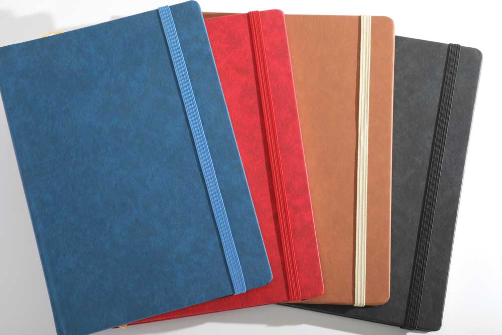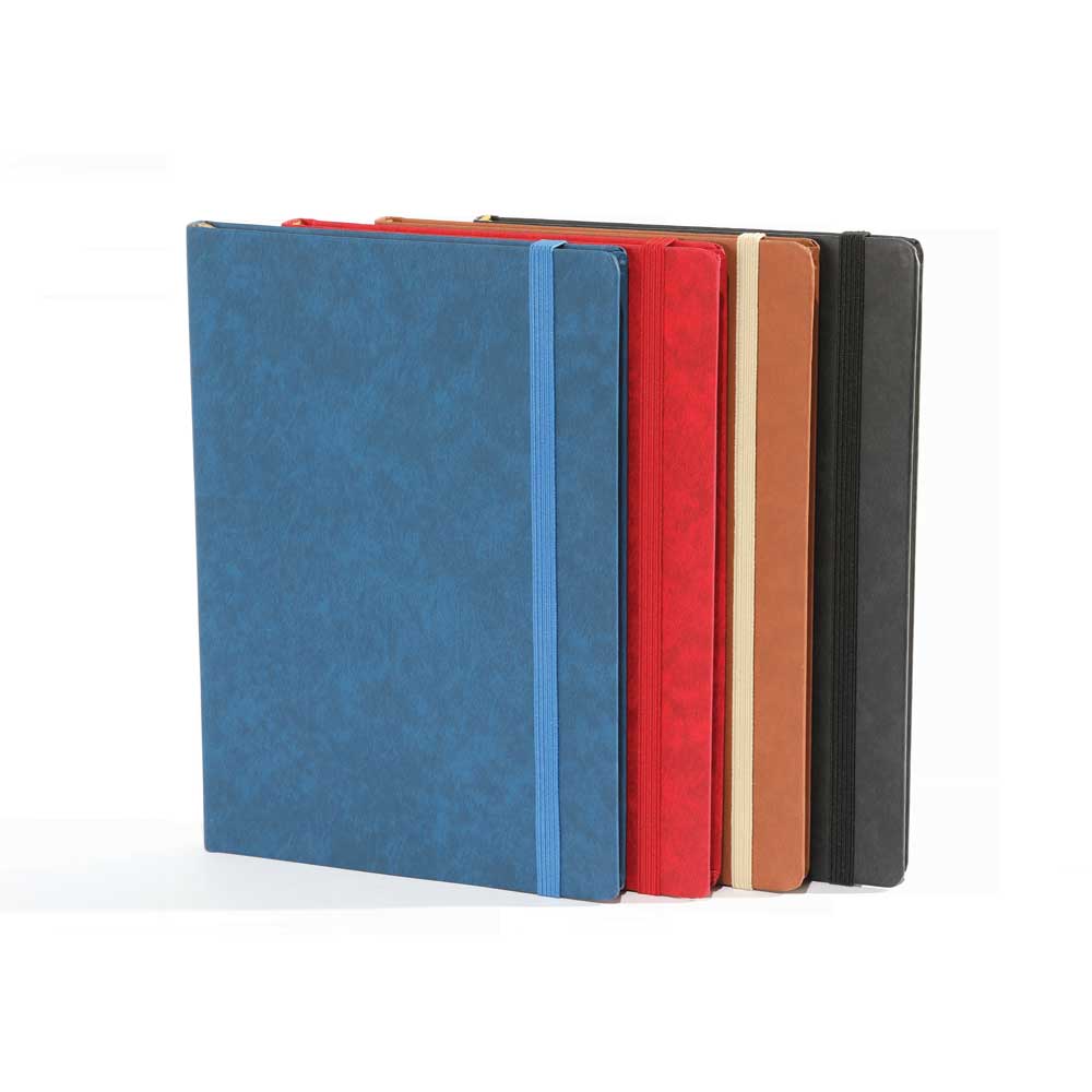 Scope: 192 pages / Dimensions: A5 ~14 x 21 cm / Paper type: 80 g/m² cream sheets / Print: One color / Binding: Sewn, hard cover, elastic band, bookmark ribbon / Recommended printing methods: Silkscreen, foil stamping, thermal printing, UV printing