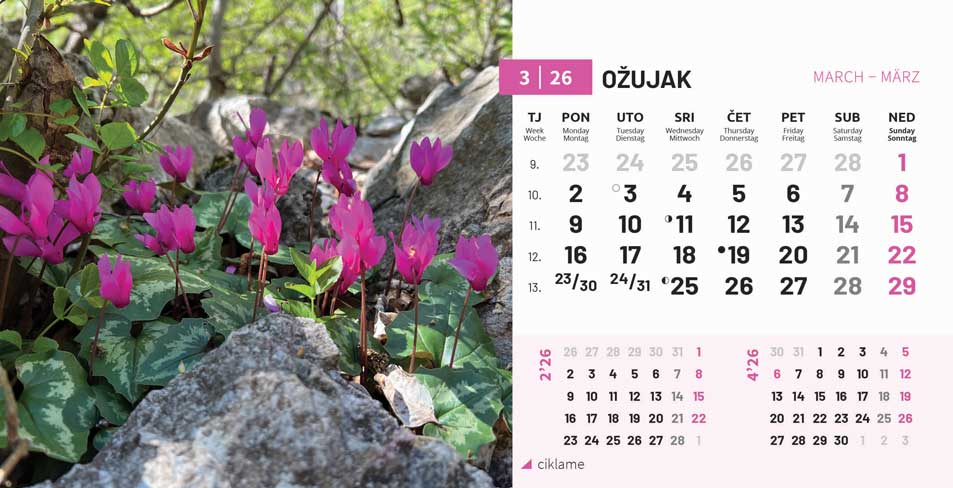 Scope: 13 sheets / Dimensions: 20.5 x 14.5 cm / Print area: 20 x 4 cm / Description: Three-month calendar, envelope / Print: Double-sided 4/4, the back of each sheet has a full-year calendar / Languages: HR, GB, DE / Paper type: KD 135 g/m² sheets, HIGH POINT 295 g/m² backing / Binding: Spiral / Packaging: 1 piece