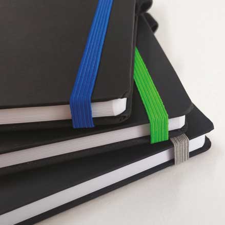 Scope: 192 pages / Dimensions: A5 ~14 x 21 cm / Paper type: 80 g/m² sheets / Print: One color / Binding: Sewn, hard cover, elastic band, bookmark ribbon, pencil holder / Recommended printing methods: Silkscreen, foil stamping, thermal printing, UV printing