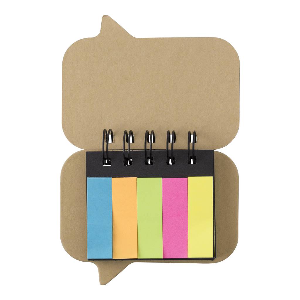 Paper, wire bound sticky note booklet with 5 colors of small sticky notes, 20 sheets per colors, and 4 colors of larger sticky notes.