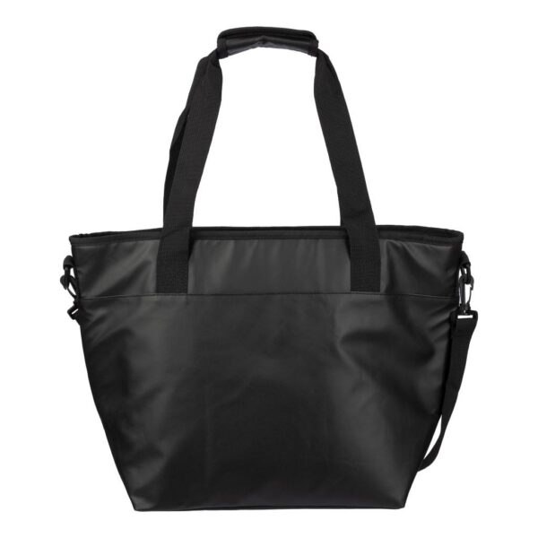 Polyester (600D) + TPE-coated and 210D/PU cooler backpack with PEVA inside. The bag includes 10 mm PE foam and a waterproof interior. Large zippered compartment on the topside and a zippered pocket on the front side. On the side, there is a mesh bottle compartment with an elastic closing band.