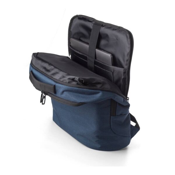Polyester (600D) two-tone backpack with PU label on the flap. One zippered pocket on the front side. One large compartment on the top side with a metal closure. Laptop compartment suitable for a 15-inch laptop. The backpack has a reinforced backside and adjustable straps.