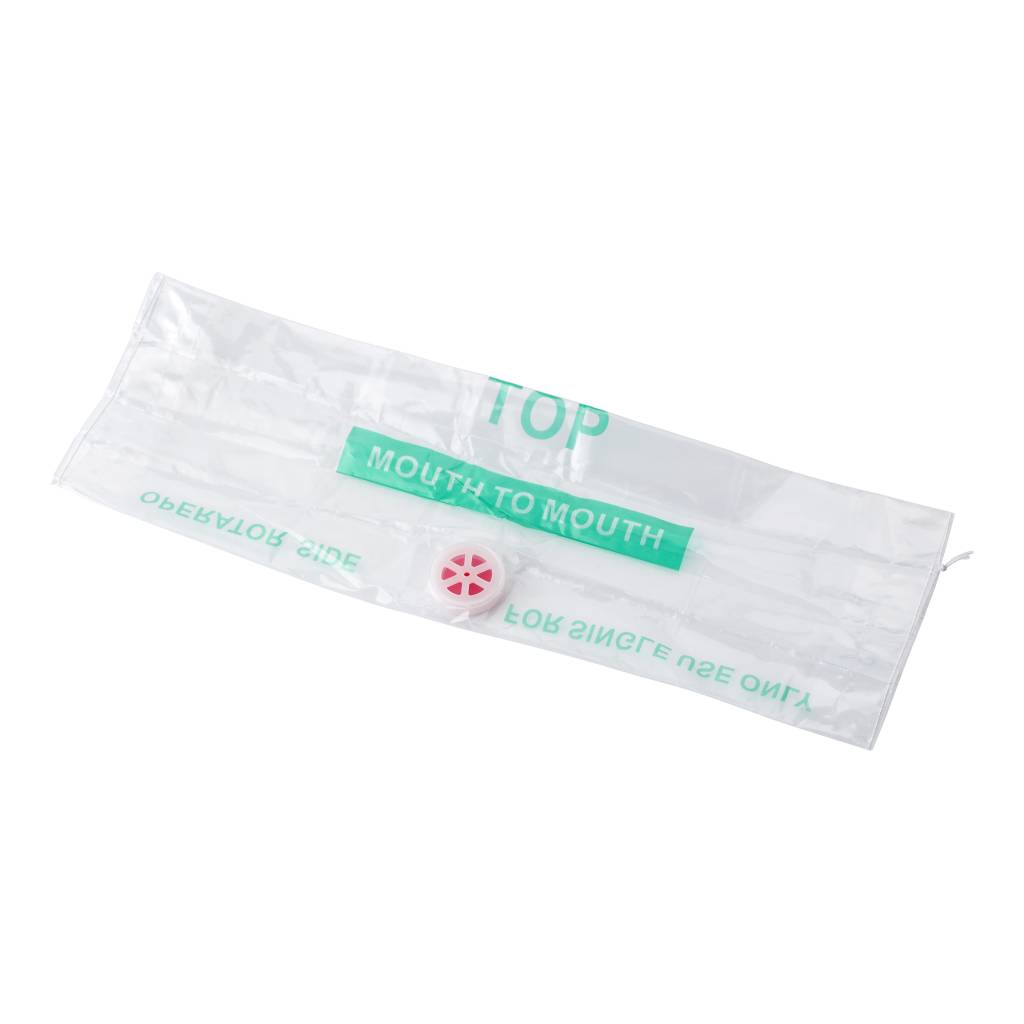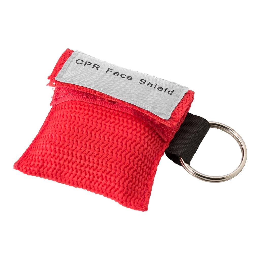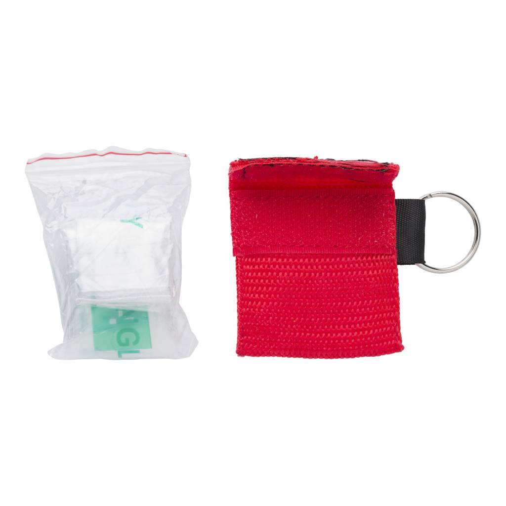 Plastic CPR mask, folded into a small polyester (600D) bag with Velcro closing.