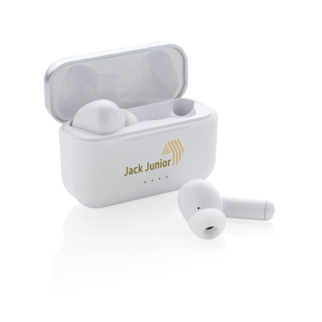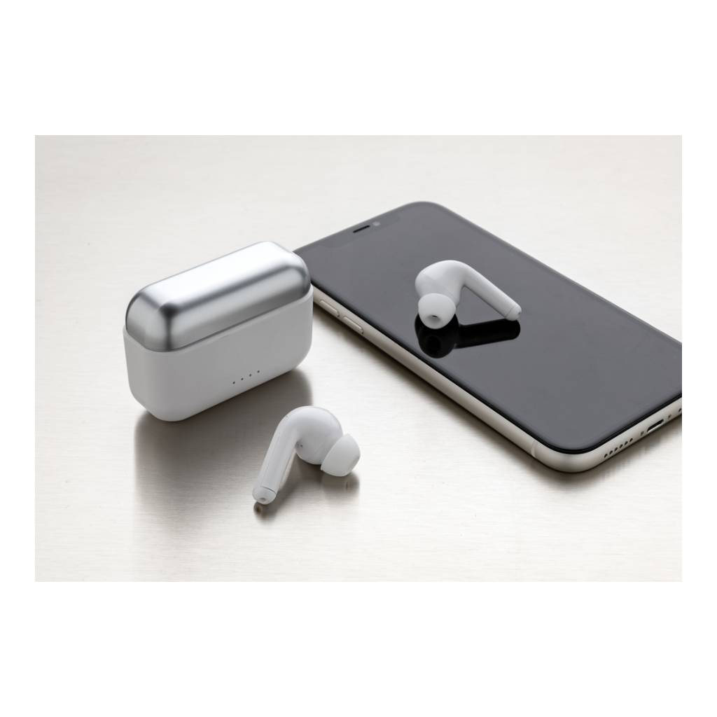 Next level true wireless earbuds in charging case with extra-long lasting battery, wireless chargeable case and extra clear sound quality and bass. The perfectly fitting earbuds have a 30 mAh battery and can be re-charged in the 300 mAh charging case within 1.5 hours via ultra-fast type C input. The charging case can also be charged by placing it on any wireless charging surface. With auto pairing function it is easy to pair to your mobile device. Playing time on medium volume about 6 hours and a standby time of 40 hours. With BT 5.0 for optimal connection. Operating distance up to 10 metres. With pick up and mic. Including 3 size silicone ear tips. Durable ABS material. With stereo function and mic to answer calls in stereo. Including 3 size silicone ear tips. Including PVC free TPE material micro charging cable.
