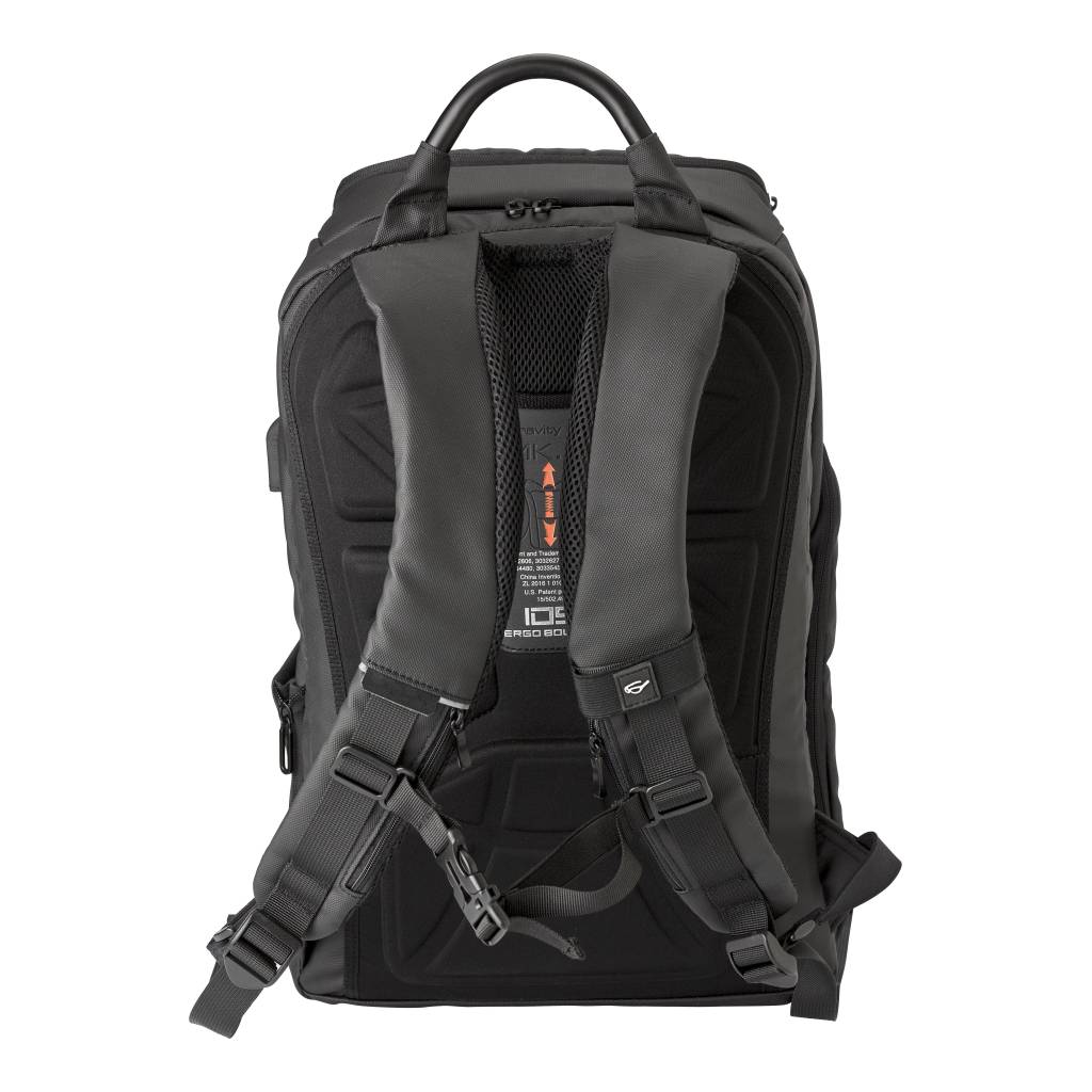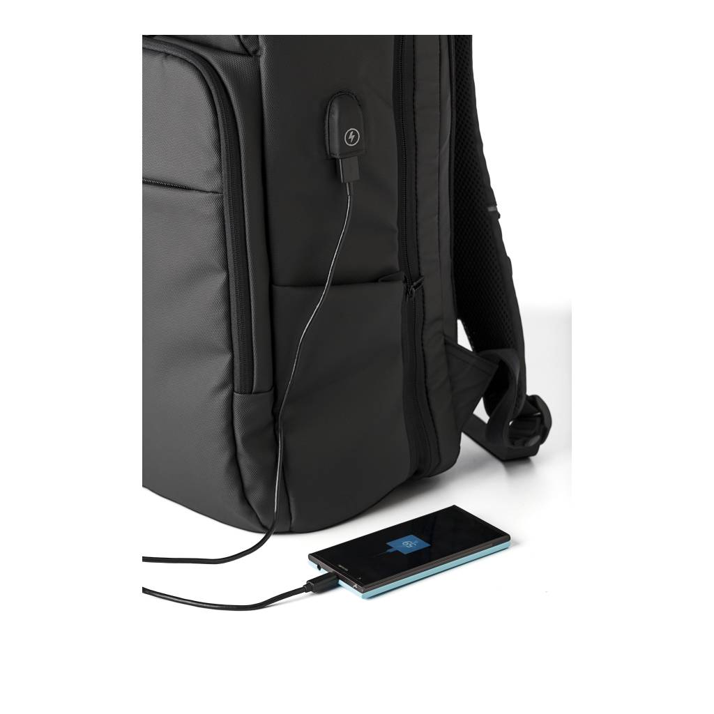 PU (600D) backpack with pockets at the front, side pocket insulated with aluminium, and on the interior a padded laptop compartment (15 inch). Padded back and padded and adjustable shoulder straps. Special weight reduction feature and USB port and cable.