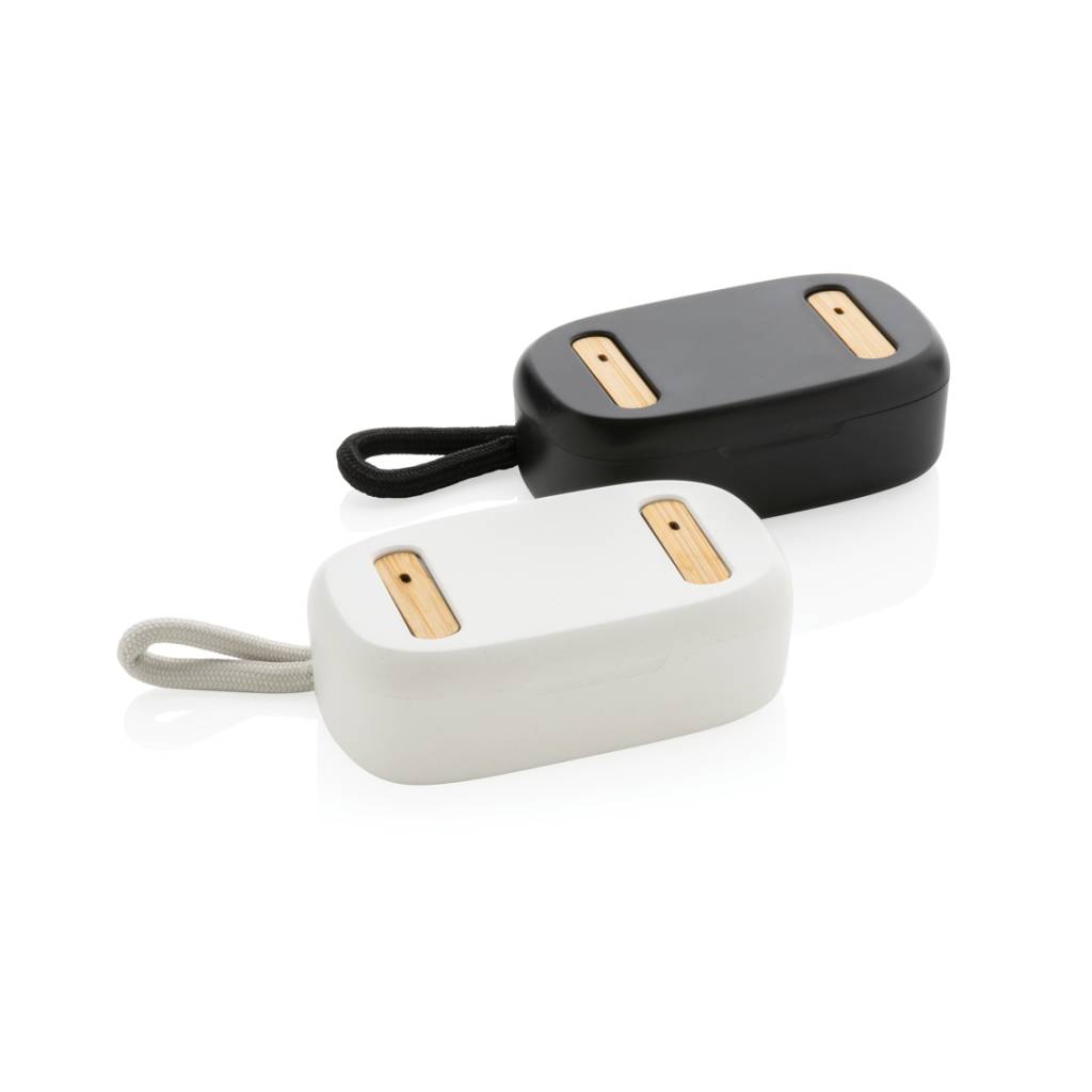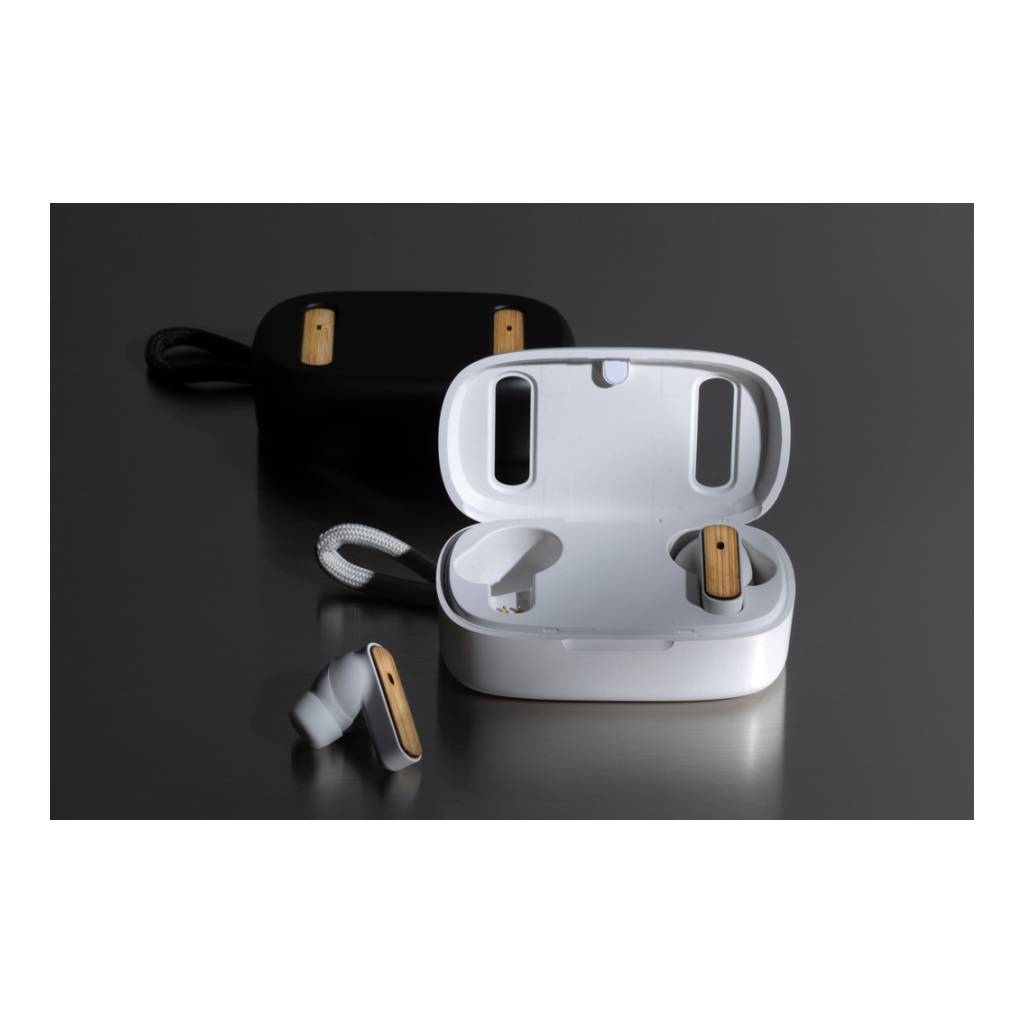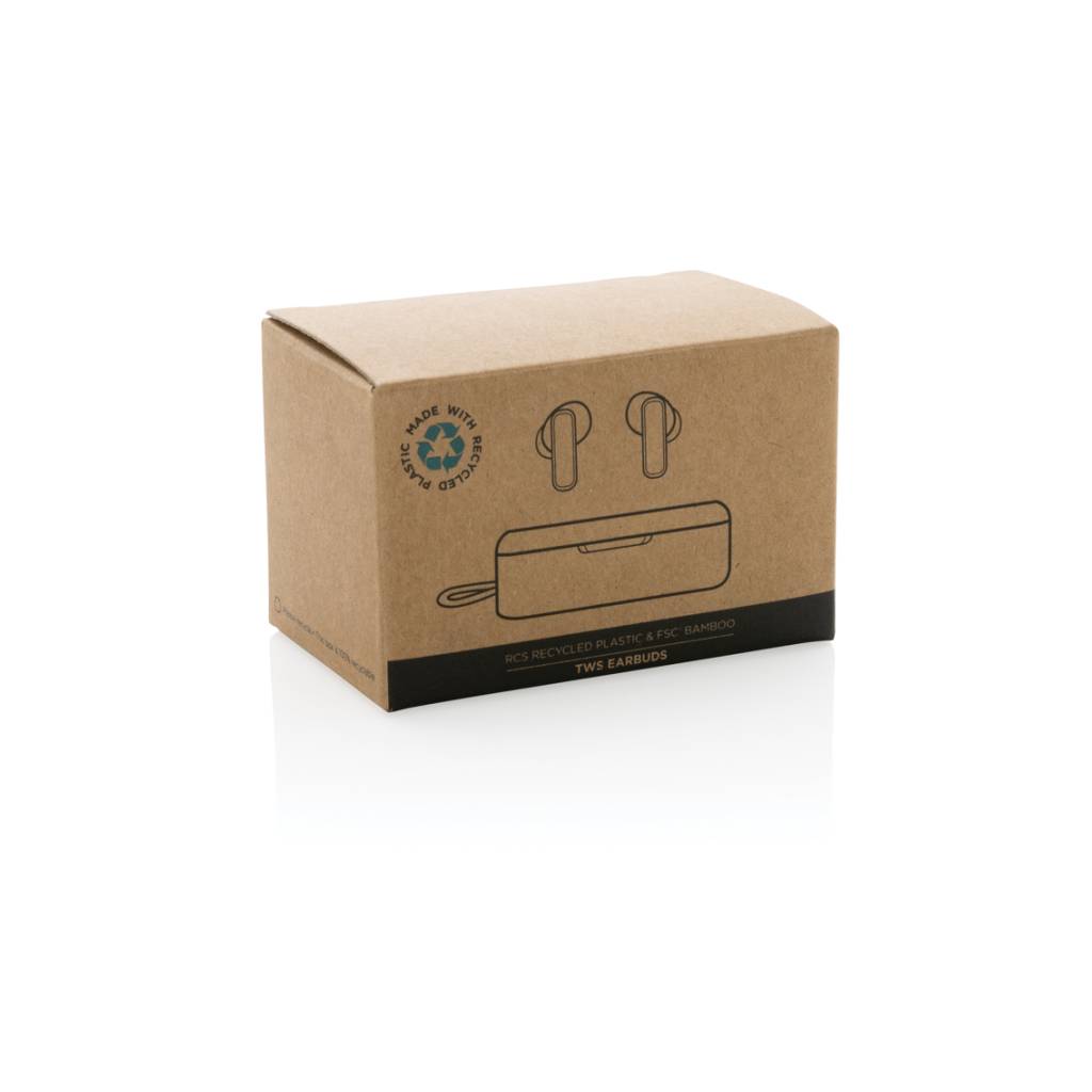 Next generation FSC® 100% Bamboo true wireless earbuds in RCS recycled ABS charging case. The earbuds and charging case are made with RCS (Recycled Claim Standard) certified recycled ABS. Total recycled content: 58% based on total item weight. RCS certification ensures a completely certified supply chain of the recycled materials. The perfectly fitting earbuds have a 40 mAh battery and can be re-charged in the 400 mAh charging case within 1 hour. With auto pairing function so easy to pair to your mobile device. Playing time on medium volume about 5 hours. With BT 5.3 for optimal connection. Operating distance up to 10 metres. With pick up and mic. Including 3 size silicone ear tips. Including GRS certified recycled TPE charging cable. Packed in FSC® mix kraft packaging. Item and accessories 100% PVC free.