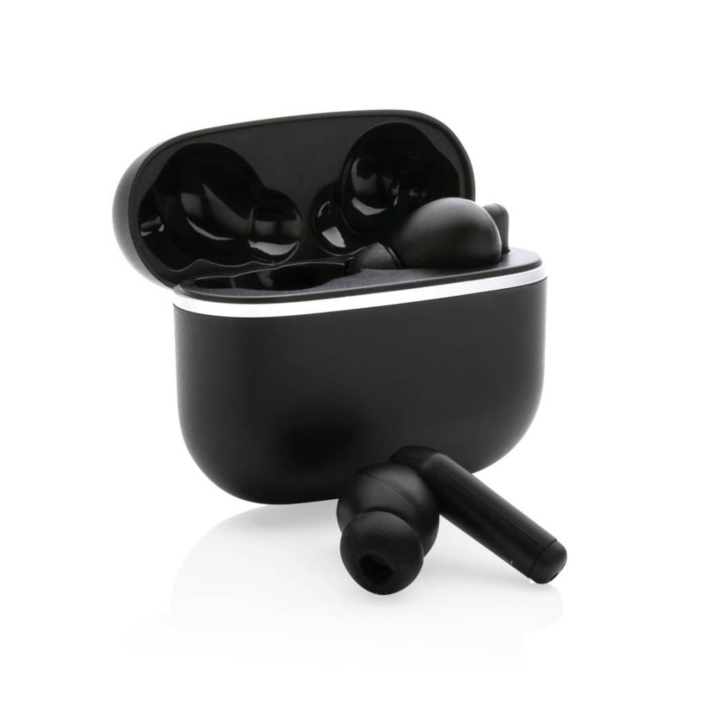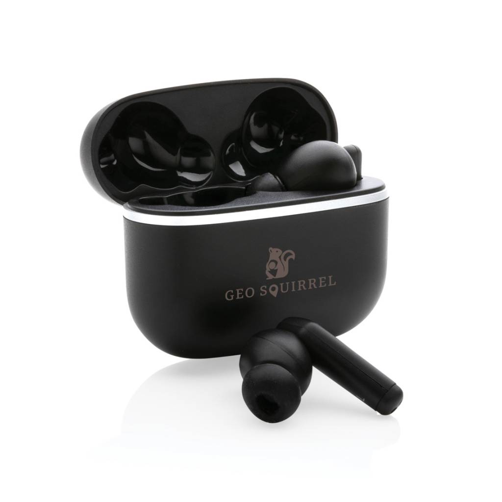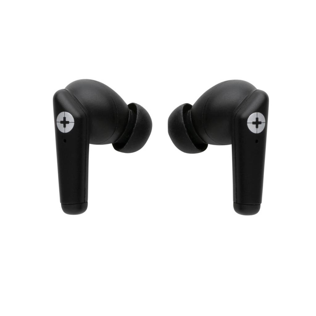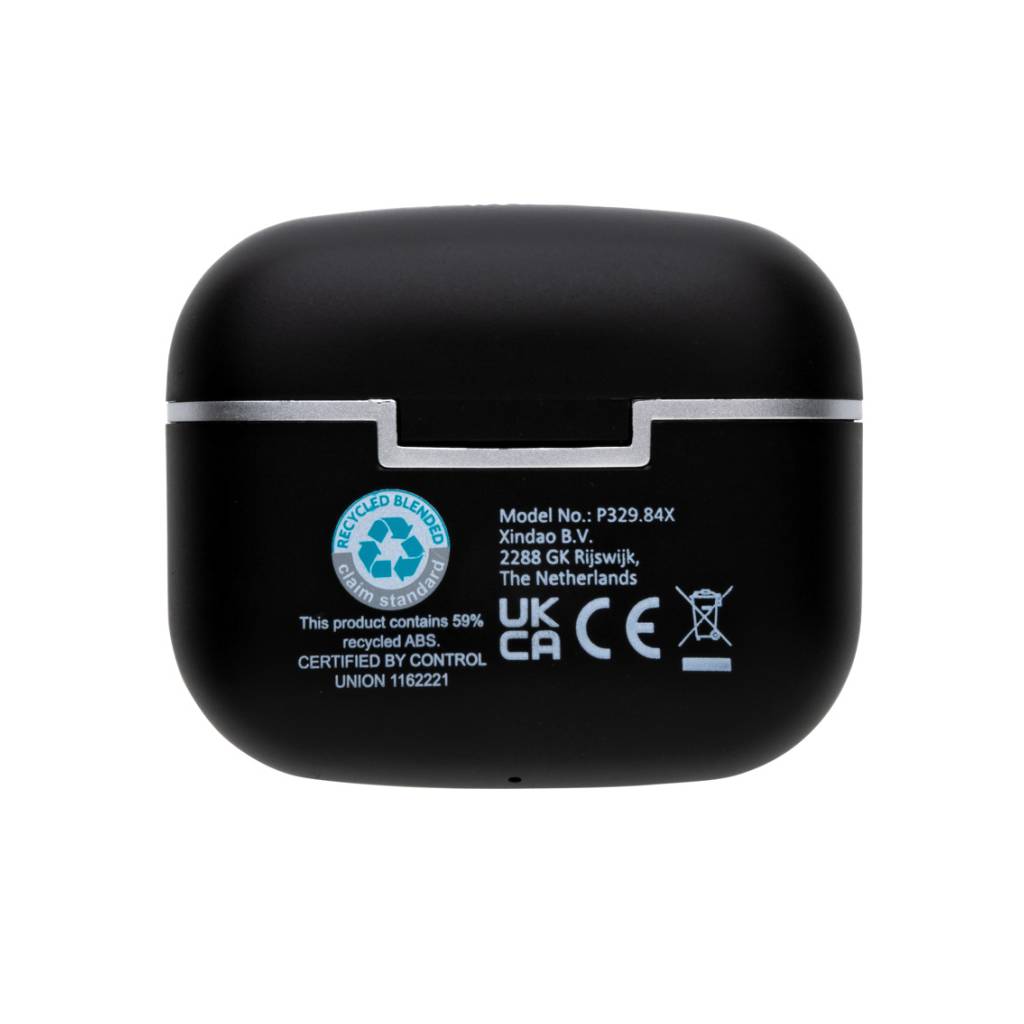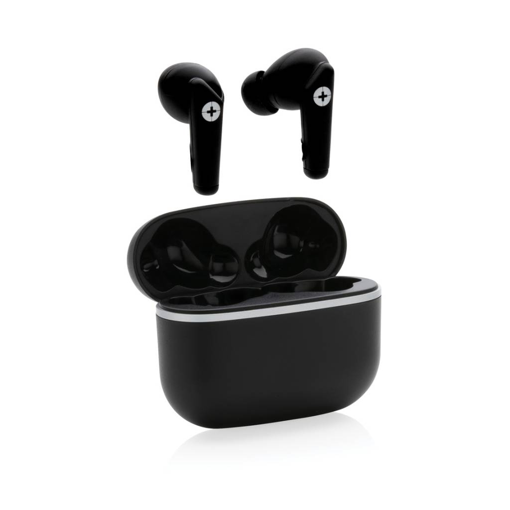 New generation true wireless earbuds. The earbuds and charging case are made with RCS (Recycled Claim Standard) certified recycled ABS. Total recycled content: 59% based on total item weight. RCS certification ensures a completely certified supply chain of the recycled materials. The earbuds come in a compact 400 mAh charging case that allows you to charge and take your earbuds wherever you go. The earbuds use BT 5.3 for automatic pairing without any hassle and with a stable connection. The earbuds have a 40 mAh battery that allows a play time of up to 4 hours and can be re-charged in 1.5 hours in the charging case. The wireless distance range is up to 10 metres. Including type C charging cable made from GRS certified recycled TPE. Packed in FSC® mix gift box. Item and accessories 100% PVC free