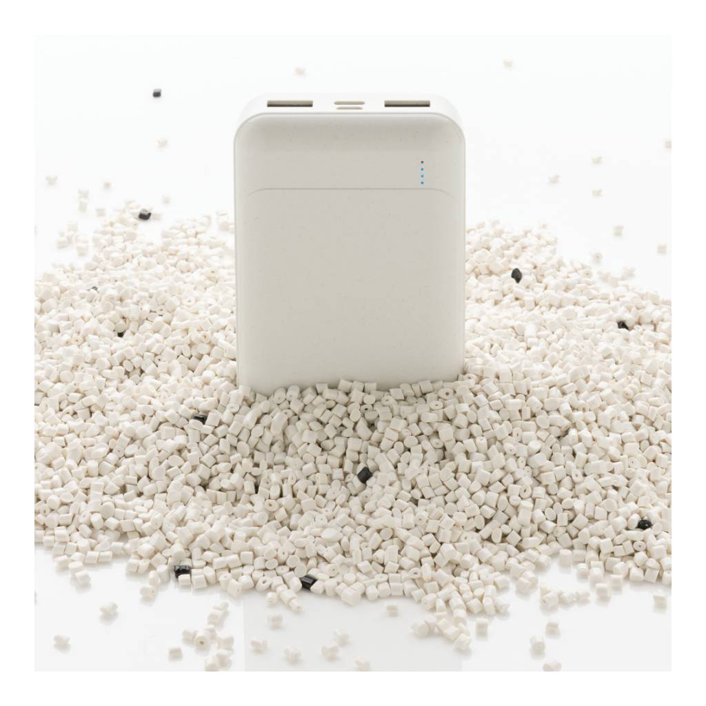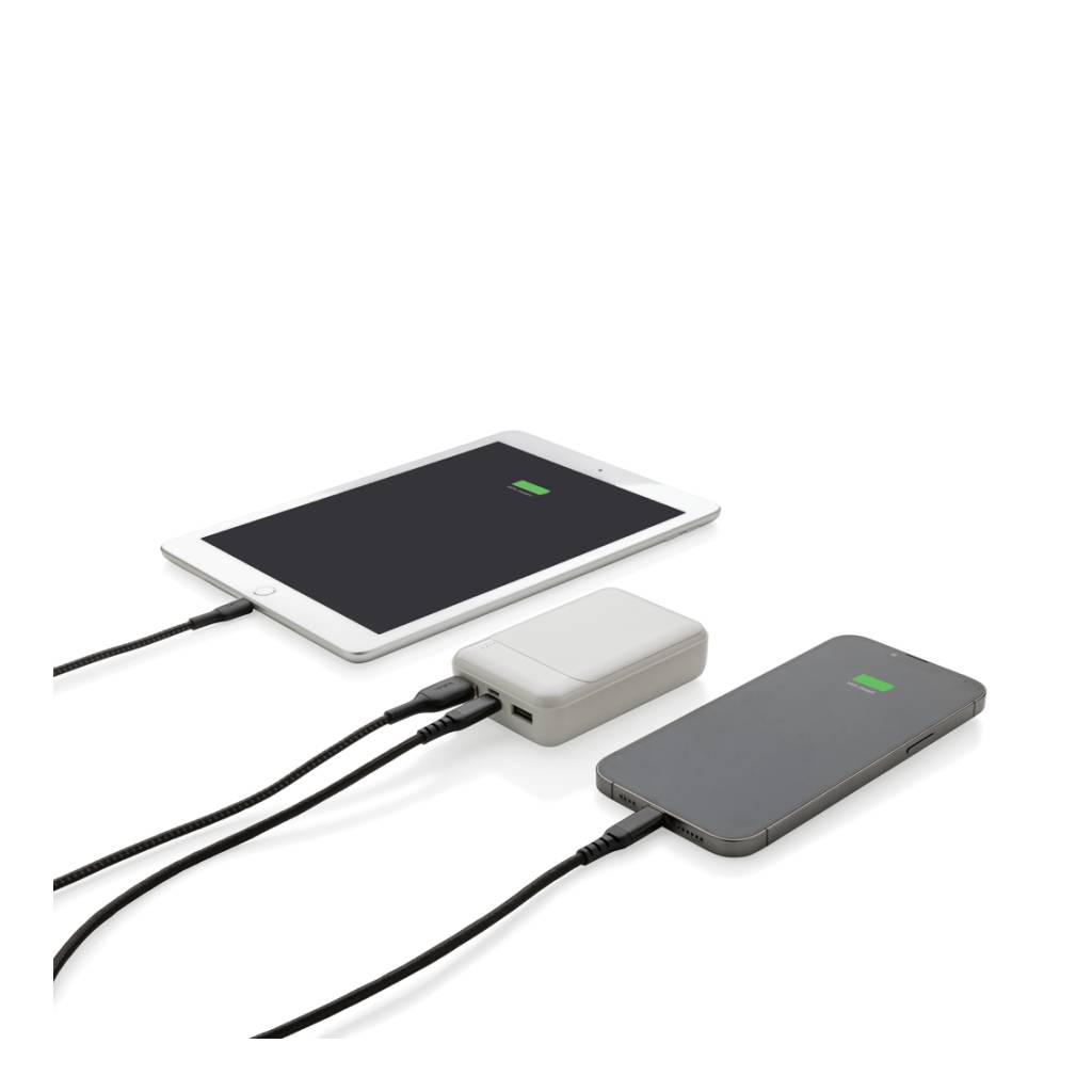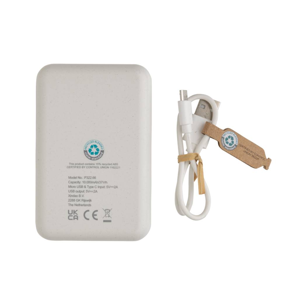 10.000 mAh pocket size powerbank where the case is made out of RCS certified recycled ABS plastic. RCS (Recycled Claim Standard) is a standard to verify the recycled content of a product throughout the whole supply chain. Total recycled content: 15% based on total item weight. When fully charged the powerbank provides you with enough energy to re-charge your mobile phone up to five times. The powerbank contains a long lasting grade A 10.000 mAh high-density lithium polymer battery. The power indicators will indicate the remaining energy level so you always know when to re-charge. Micro USB Input 5V/2A; Type-C Input 5V/2A; USB output 5V/2A; Item and accessories PVC free. Including PVC free recycled TPE material charging cable.