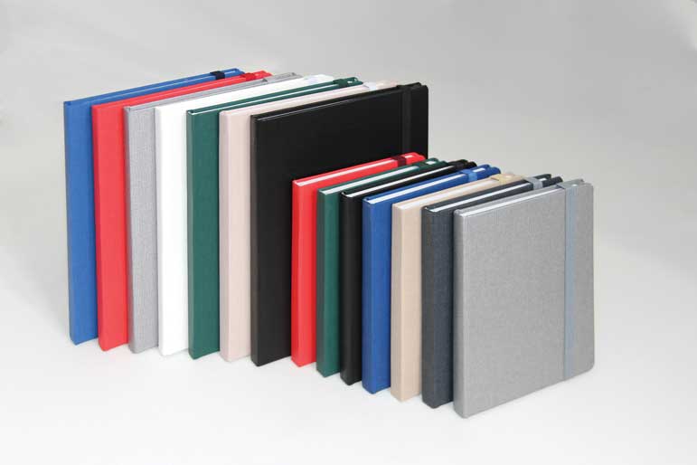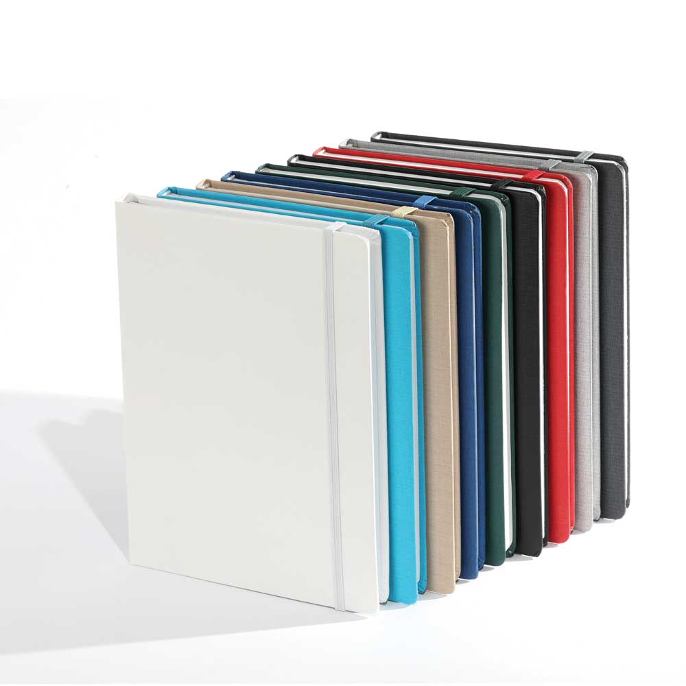 Scope: 192 pages / Dimensions: ~A5 (14 x 21 cm) / Paper type: 80 g/m² sheets / Print: One color / Binding: Sewn, hard cover, elastic band, ribbon marker / Recommended printing methods: Silkscreen, foil stamping, thermal printing, UV printing