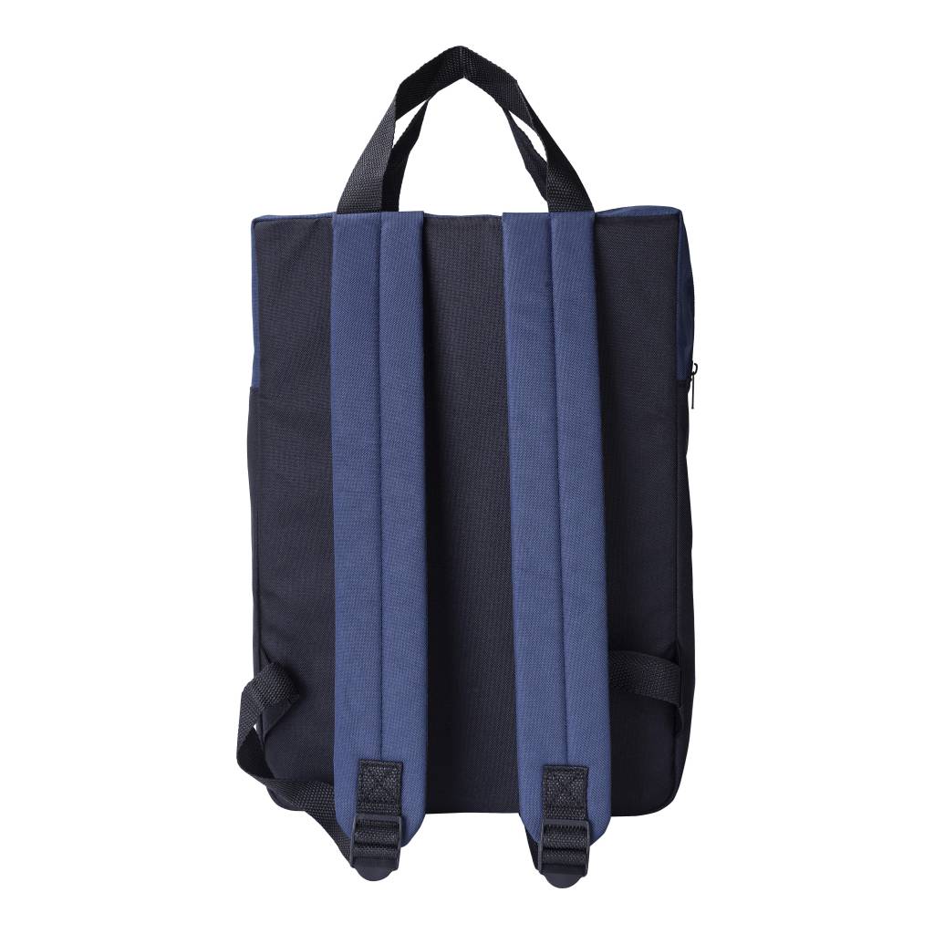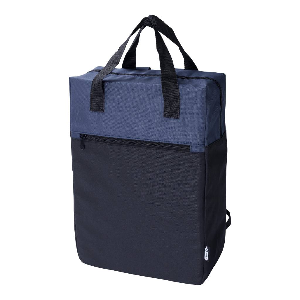 RPET polyester (600D) backpack. One compartment. One zippered front pocket. color detail on the top, black on the bottum. Carying handles on the top.