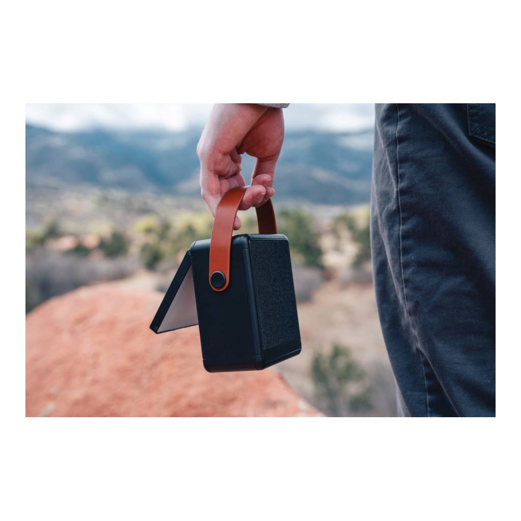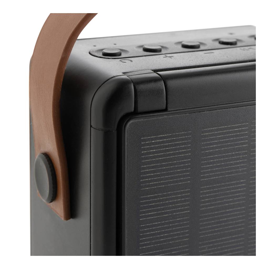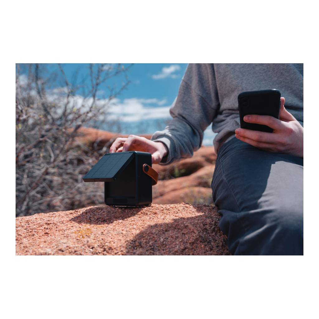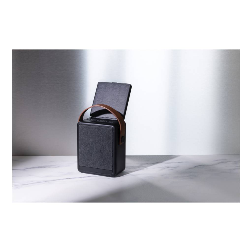 Powerful 12W wireless speaker with integrated large solar panel in RCS certified recycled ABS. Total recycled content: 16% based on total item weight. RCS certification ensures a completely certified supply chain of the recycled materials. The speaker uses high quality monocrystalline solar panels with 19% conversion rate. Charge rate depends on conditions. With integrated LED lamp to use the speaker even when the sun has set. The speaker is equipped with a 2000 mAh battery to ensure up to 8 hours of playing time and BT5.3 for smooth connection and clear sound. Connection range up to 10 metres. With mic and pick up function to answer calls. Charging speed solar: 5V/300mA. Packed in FSC mix FSC® box. Including RCS certified recycled TPE charging cable. Item and accessories 100% PVC free