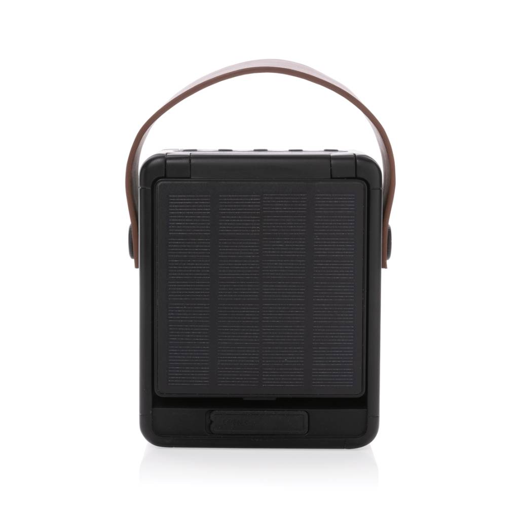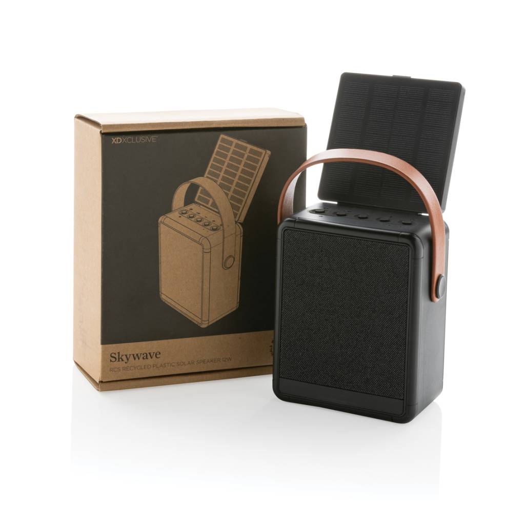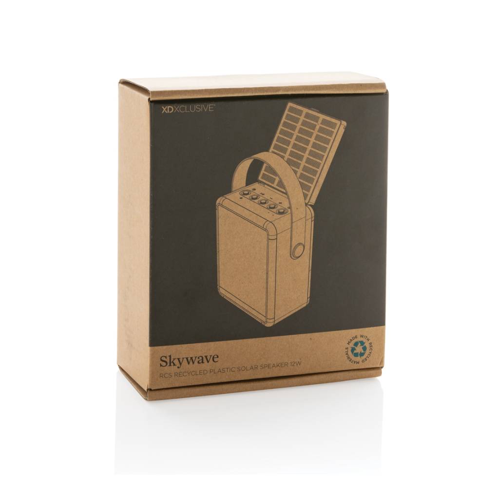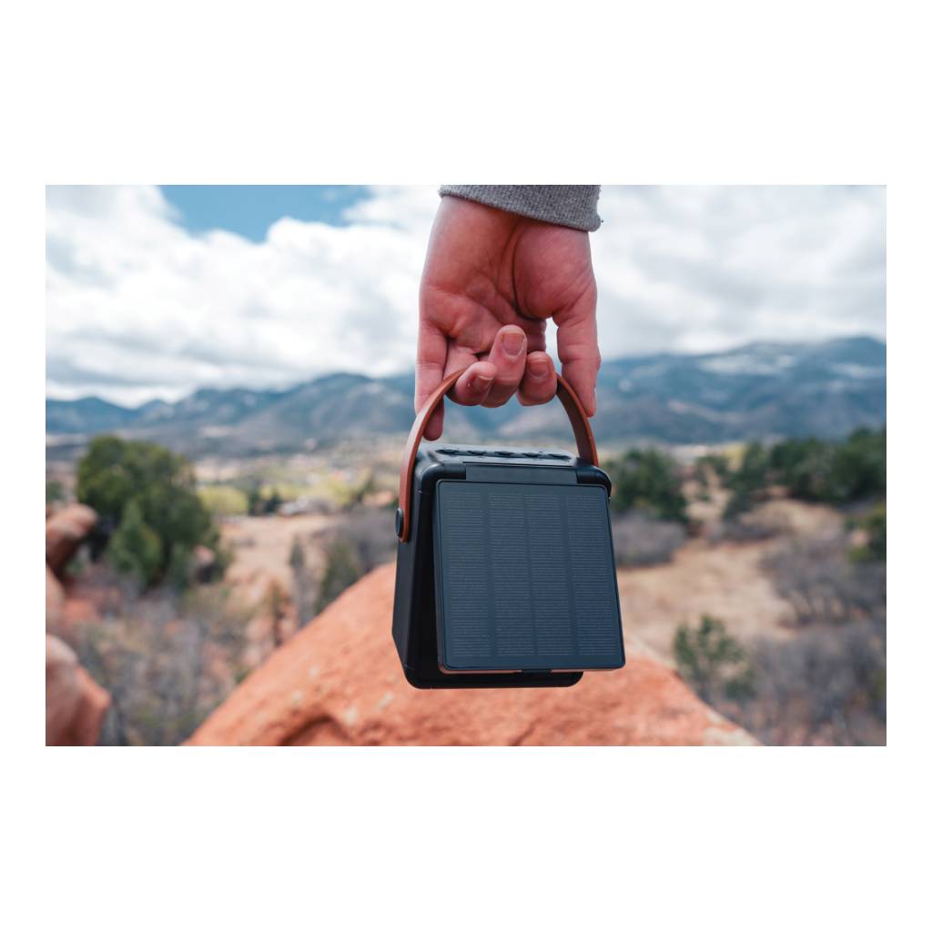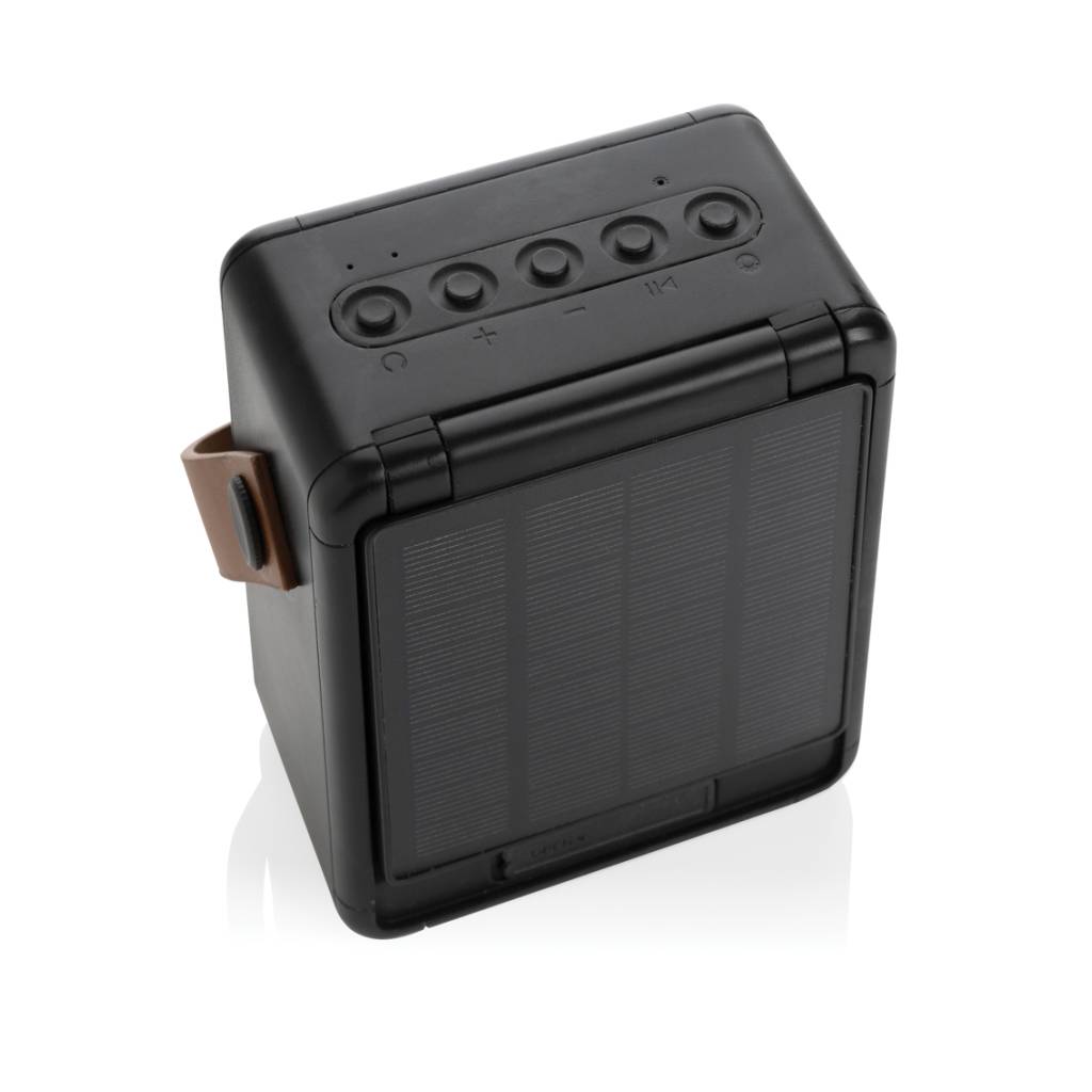 Powerful 12W wireless speaker with integrated large solar panel in RCS certified recycled ABS. Total recycled content: 16% based on total item weight. RCS certification ensures a completely certified supply chain of the recycled materials. The speaker uses high quality monocrystalline solar panels with 19% conversion rate. Charge rate depends on conditions. With integrated LED lamp to use the speaker even when the sun has set. The speaker is equipped with a 2000 mAh battery to ensure up to 8 hours of playing time and BT5.3 for smooth connection and clear sound. Connection range up to 10 metres. With mic and pick up function to answer calls. Charging speed solar: 5V/300mA. Packed in FSC mix FSC® box. Including RCS certified recycled TPE charging cable. Item and accessories 100% PVC free