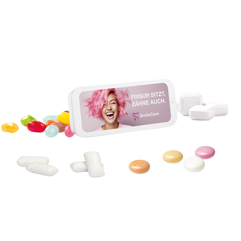 Flat metal box with a sliding lid, white, tinplate 98% recyclable, individually printed. Content: Mentos chewy candy fruit (strawberry, orange, lemon – mixed), 13 g.