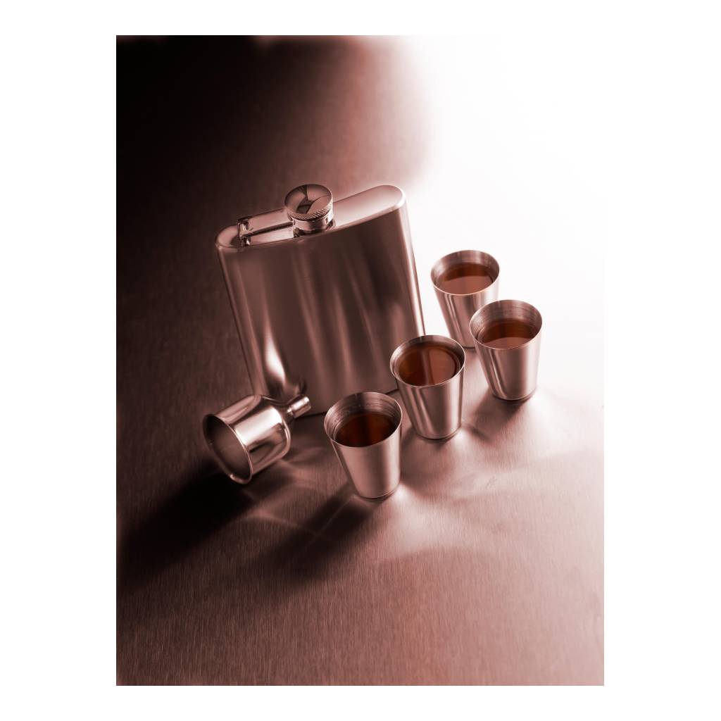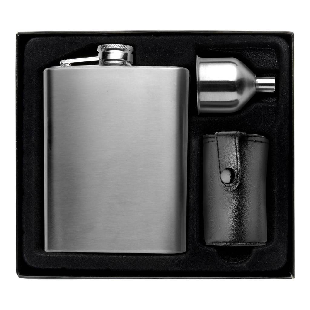 Stainless steel (s/s304) drinking set with hip flask (220 ml), four cups (30 ml), and a funnel. Packaged in gift box.