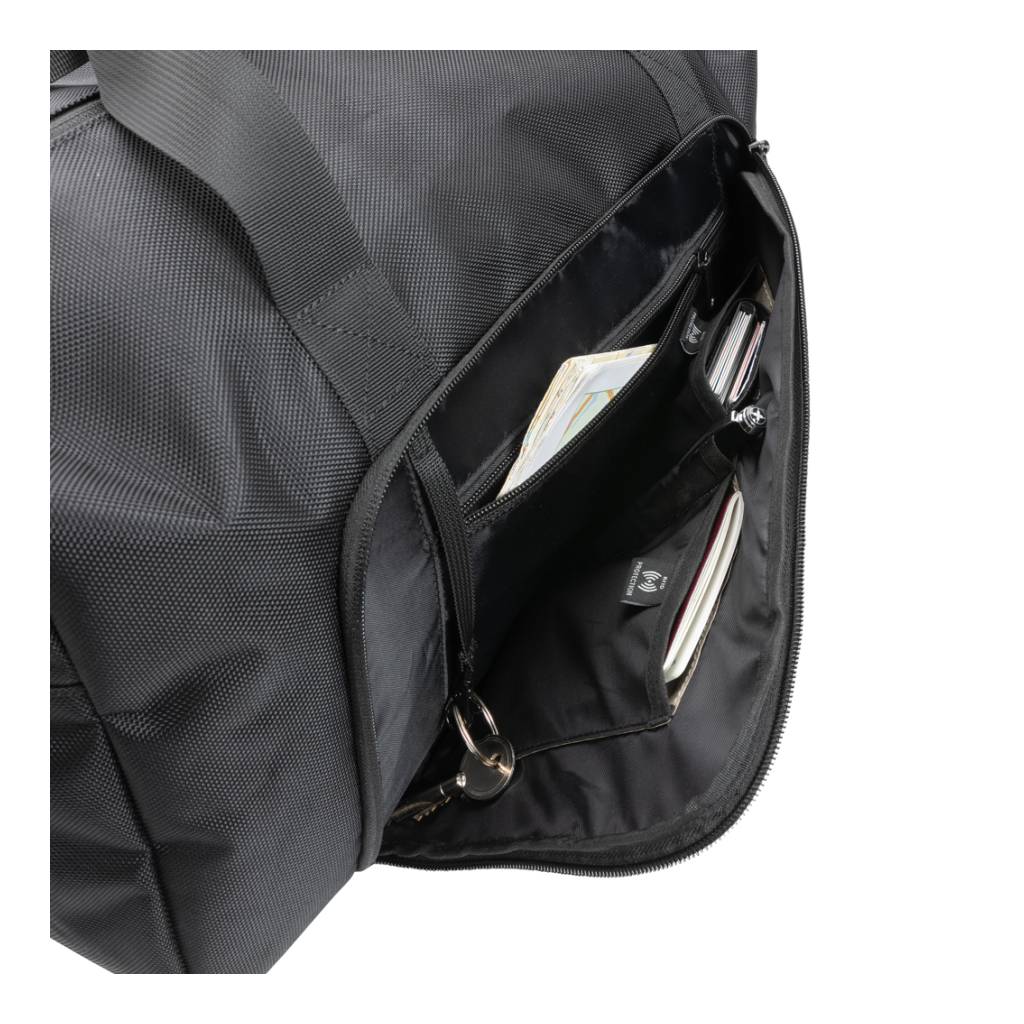 The Swiss Peak AWARE™ RPET Voyager weekend bag is a modern travel bag. Made from durable 1680D recycled polyester with rich PU details, the bag is a perfect companion for a weekend away. The travel bag has a roomy compartment and an internal zipper pocket. The front zipper pocket houses multiple pockets for handy internal organisation. Additional features are a luggage tag and RFID pockets. In short: an absolute must-have for a weekend away. The exterior is made from 1680D recycled polyester and the lining is 150D recycled polyester. With AWARE™ tracer that validates the genuine use of recycled materials. Each bag has reused 50.7 0.5L PET bottles. 2% of proceeds of each product sold containing AWARE™ will be donated to Water.org.