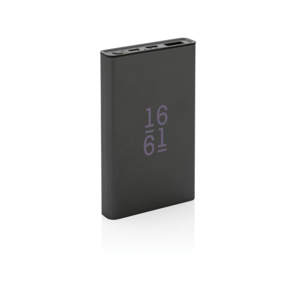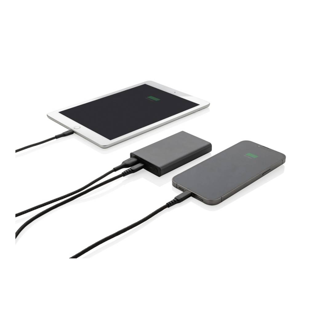 Powerbank made with RCS (Recycled Claim Standard) certified recycled aluminium and ABS. Total recycled content: 36% based on total item weight. RCS certification ensures a completely certified supply chain of the recycled materials. Aluminium does not lose its characteristics in the recycling process and can be recycled endlessly. The powerbank contains a long-lasting grade A 5.000 mAh lithium polymer battery. The power indicators will indicate the remaining energy level so you always know when to re-charge. Item and accessories 100% PVC free. Including type C charging cable made from RCS certified recycled aluminium, TPE and PET. Packed in FSC® mix packaging. USB output 5/2.4A, Type C output: 5V/2.4A. Type C input: 2.4A. Micro USB input: 5V/2A.