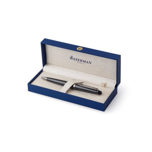 Waterman Expert stainless steel ballpen with palladium trim. Blue ink. Pre-packaged in giftbox.