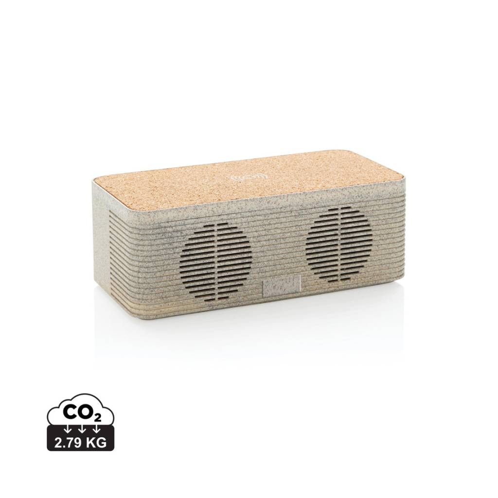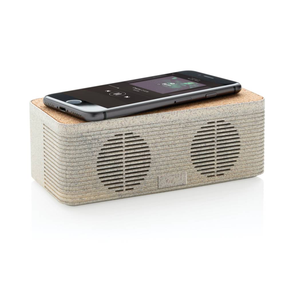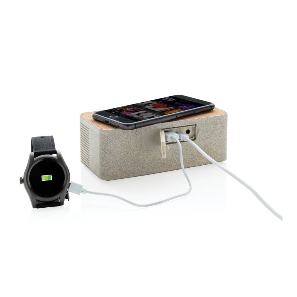 This sleek looking wheat straw (35% wheat fiber mixed with ABS) and cork wireless charging speaker enables you to combine listening to your favorite tunes while charging your phone wirelessly. Simply connect the included 150 cm Type C cable to your charger at home or in the office and you are ready to go. It contains a 5W wireless speaker and a 5W wireless charger on top with a Type C input port and AUX port. The speaker has a 1200 mAh battery and BT 5.0 that allows a playtime up to 4 hours and operating distance up to 10 metres. When using both functions make sure the item is connected to a power source.