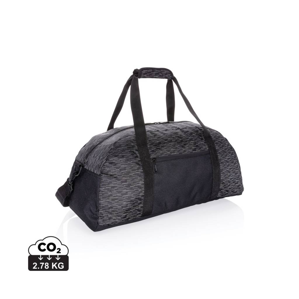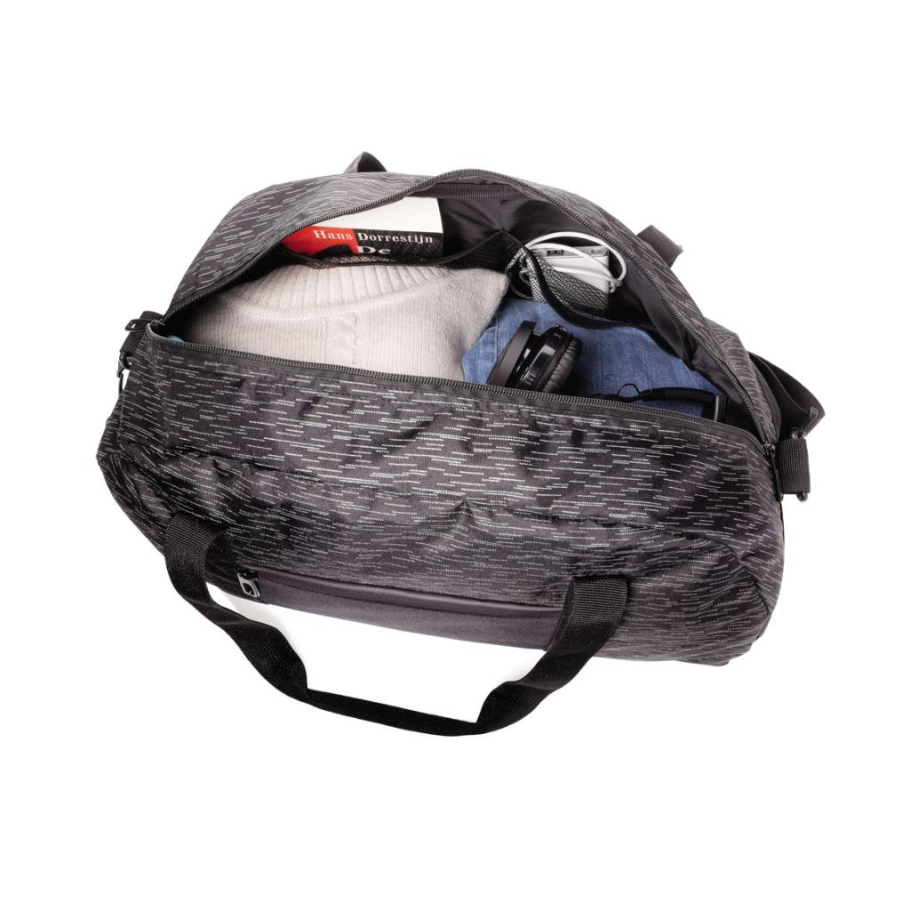 Povećajte svoju vidljivost sa stilom s ovom vikend torbom izrađenom od 100% recikliranog poliestera i AWARE™ tragača. Uz AWARE™, zajamčena je upotreba izvornih recikliranih tkanina i tvrdnje o utjecaju na smanjenje vode, korištenjem AWARE disruptivnog fizičkog tragača i blockchain tehnologije. Štedite vodu i koristite originalne reciklirane tkanine. Vikend duffel ruksak ima moderan reflektirajući print i prednji džep s patentnim zatvaračem. Unutar glavnog odjeljka nalaze se 2 mrežasta džepa. Bez PVC-a. Ova torba uštedjela je 10 litara vode, a sastoji se od 19 plastičnih boca.