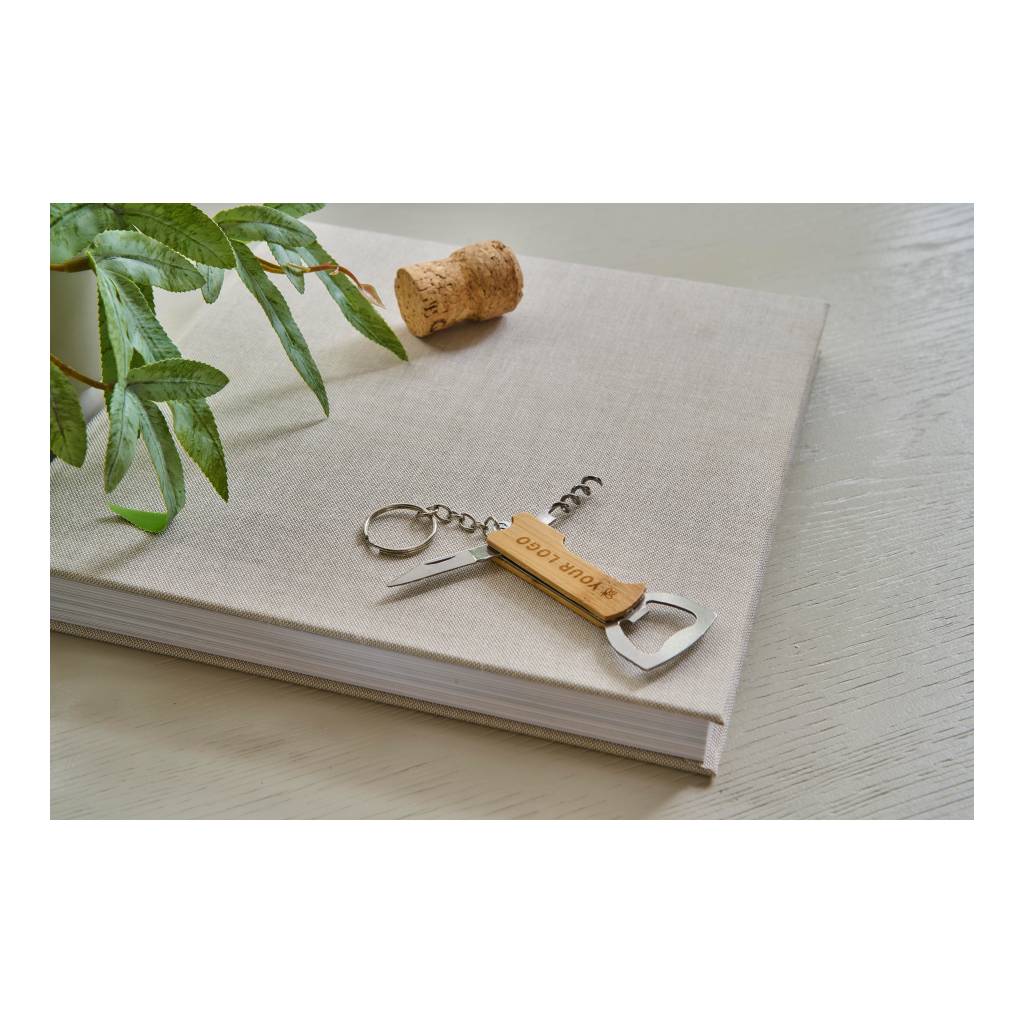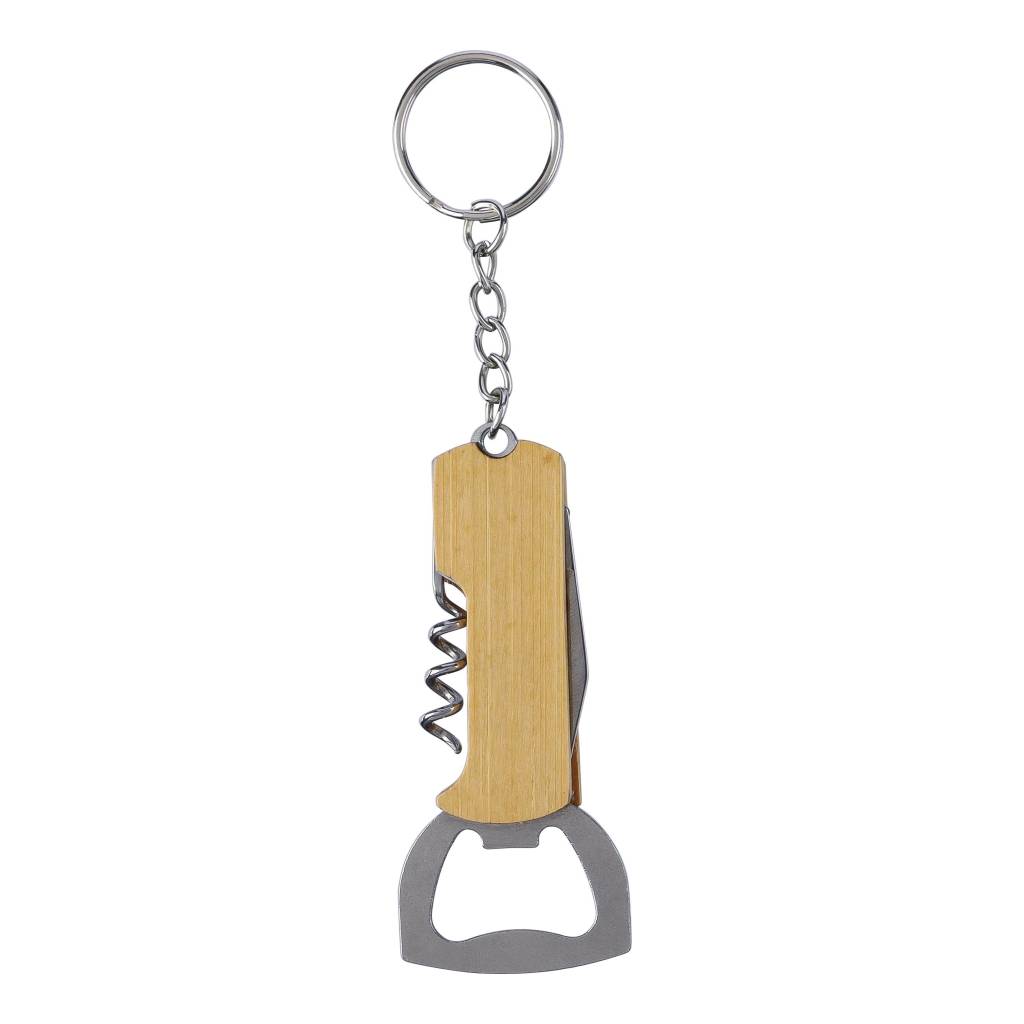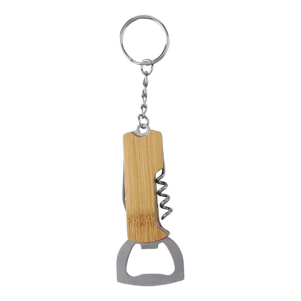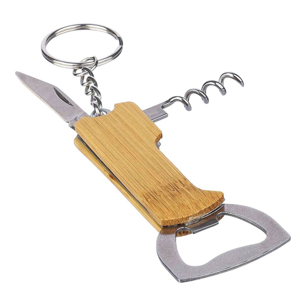 Višenamenski alat od bambusa s 3 funkcije, uključujući metalni privjesak za ključeve. Funkcije uključuju otvarač za boce, džepni nož i vadičep. Pojedinačno pakirano u smeđu kartonsku kutiju.