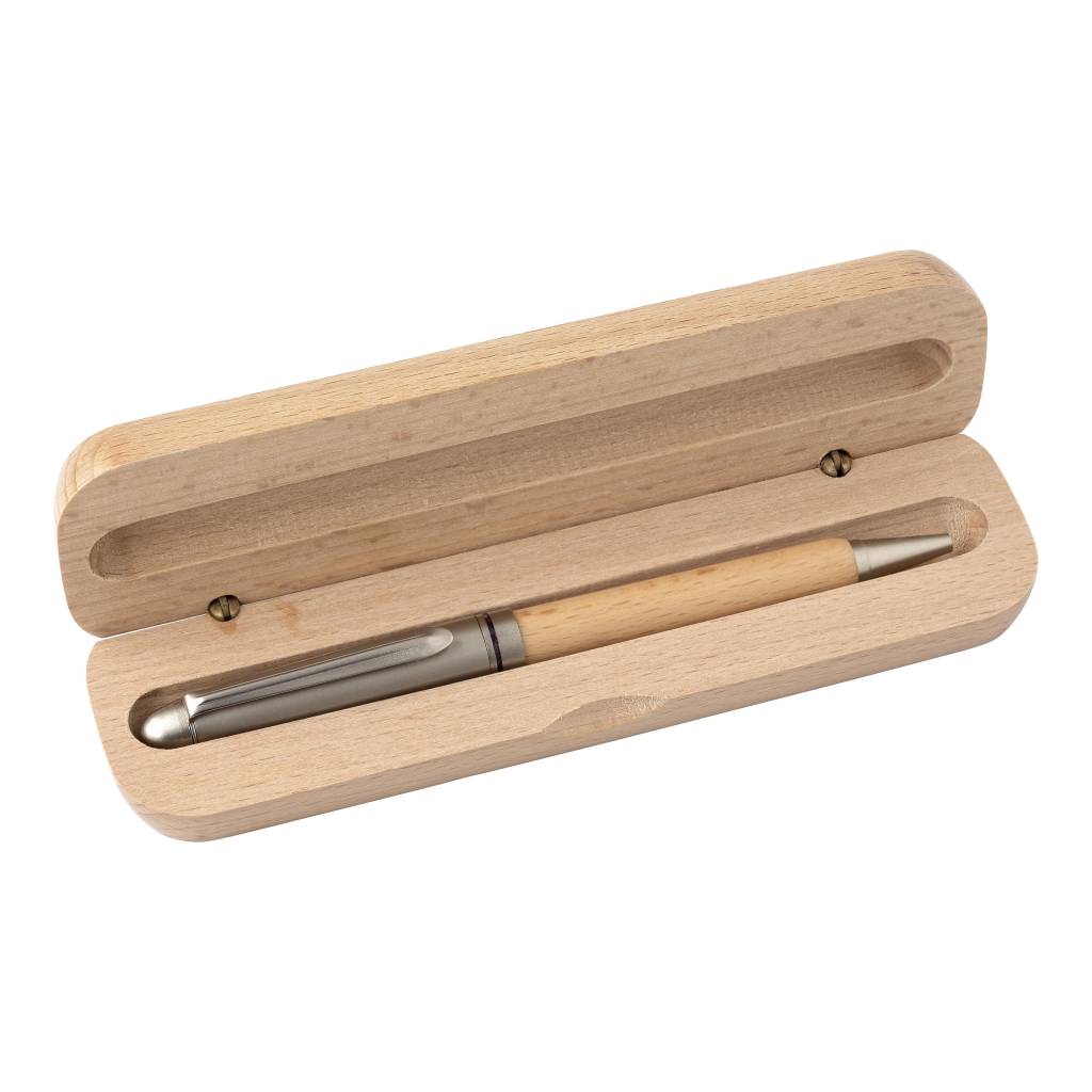 Kemijska olovka od bukovine i metala. Pakirano u bukovu kutiju za olovke. Plava tinta. Isporučuje se s njemačkom dokumentalnom tintom.