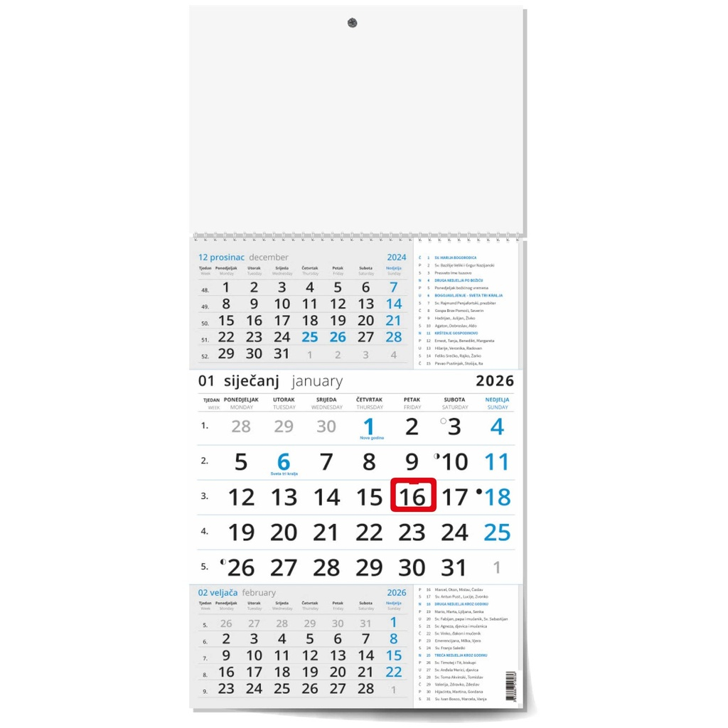 “Poslovni PLAVI S KATOLIČKIM KALENDAROM” trodjelni kalendar, 12 list., dim: 29,5x62cm, PVC vrećica, pokazivač, P/50
