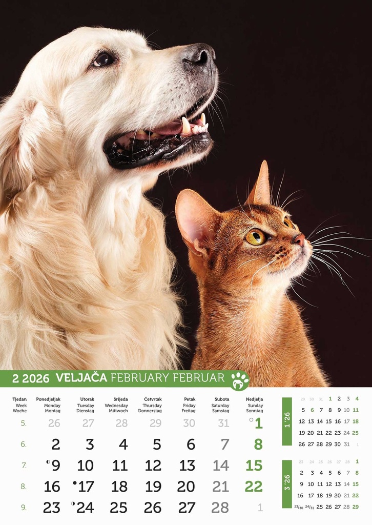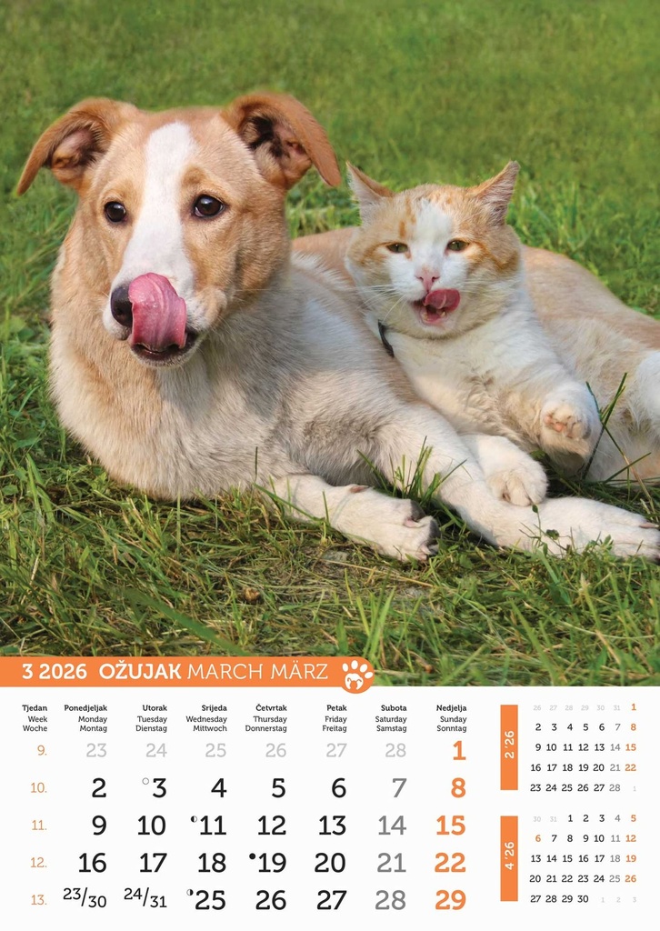 “PSI i MAČKE” 13 list., dim: 30,5×50 cm, PVC vrećica, P/50, kalendar u boji