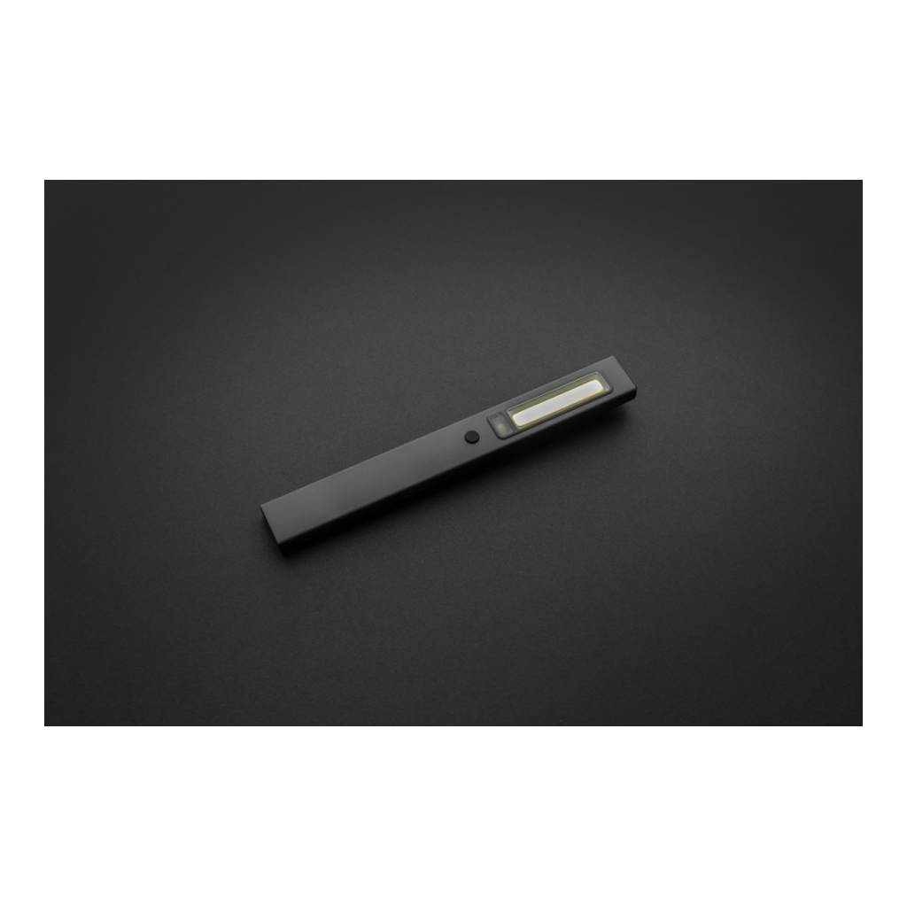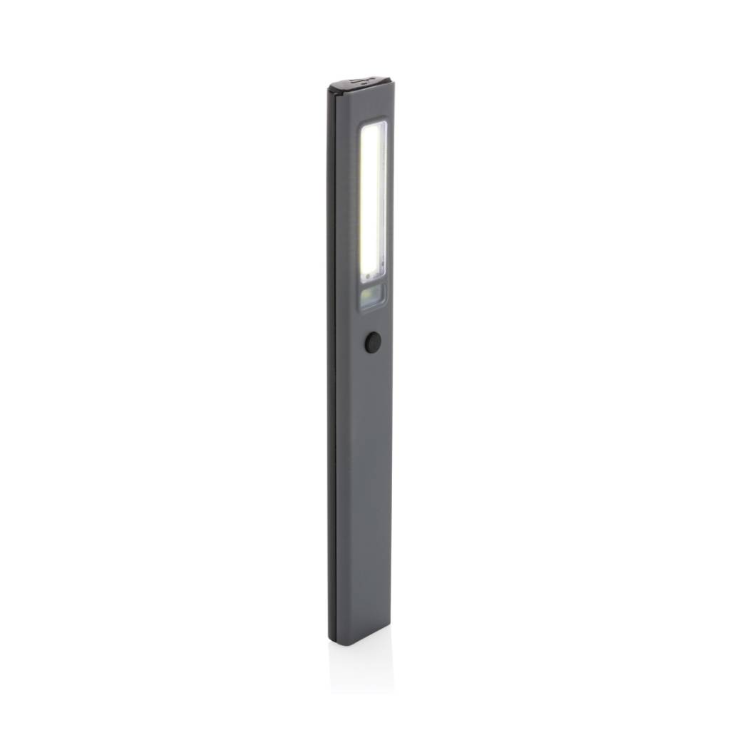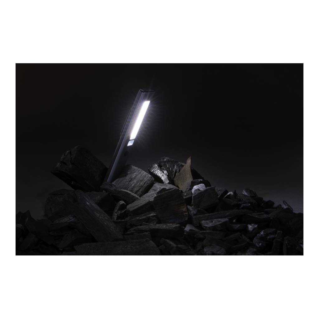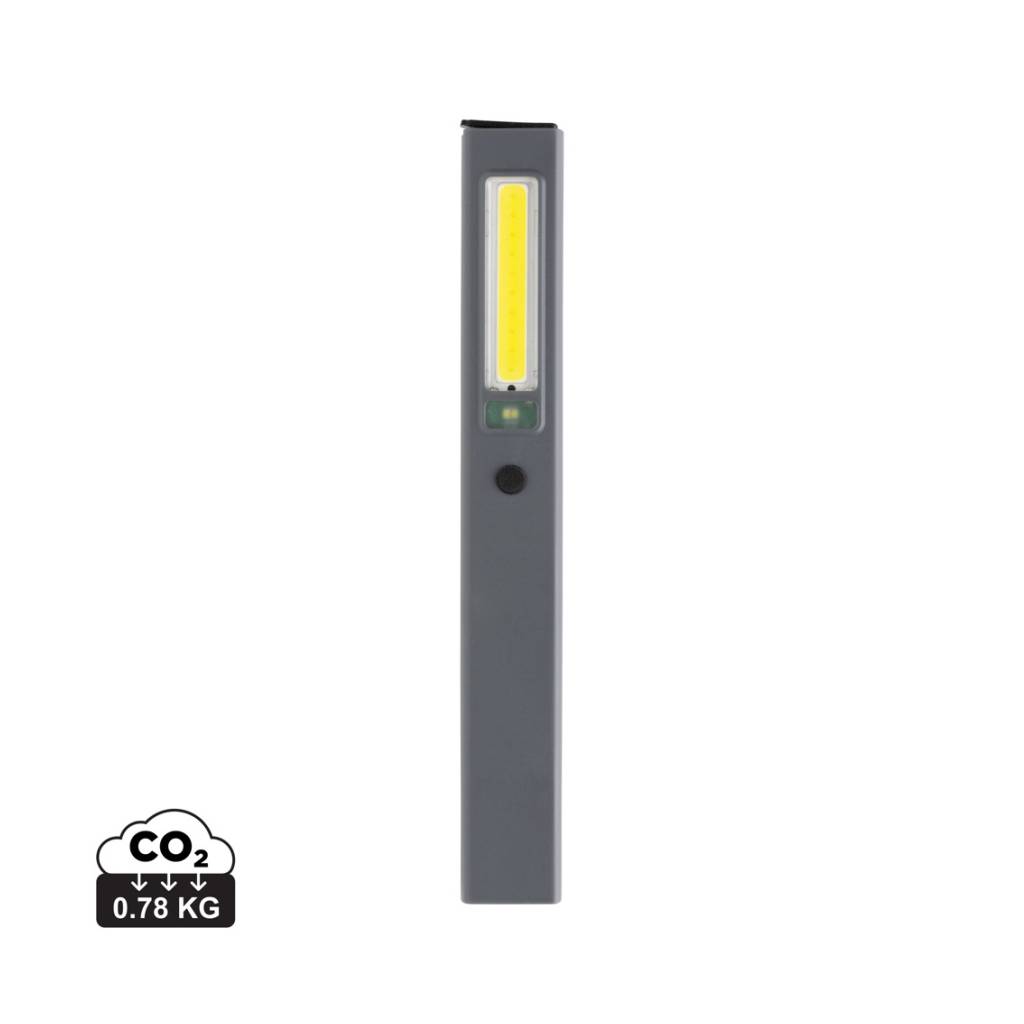 Inspekcijska lampica džepne veličine izrađena od reciklirane ABS plastike s RCS certifikatom. Ukupni reciklirani sadržaj: 33% na temelju ukupne težine predmeta. RCS certifikat osigurava potpuno certificirani opskrbni lanac recikliranih materijala. Radno svjetlo koristi punjivu litijsku bateriju razreda A od 520 mah tako da nema potrebe za zamjenom baterija. Jednostavno ponovno napunite putem svoje USB utičnice. Radno svjetlo dolazi s COB svjetlom od 220 lumena i LED svjetlom od 80 lumena. S 3 načina rada: LED, COB i COB crveni. S kopčom za pričvršćivanje na remen ili džep i magnetom. S priključkom tipa C za ponovno punjenje. Vrijeme rada s jednim punjenjem: 3 sata.