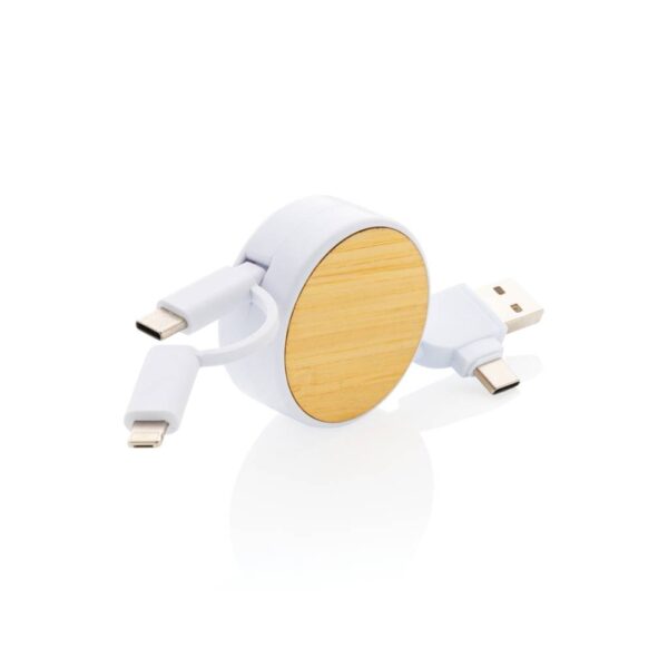Pleteni najlonski multi kabel s 5 različitih konektora: USB C in, USB A in, type C out, IOS out i micro USB out. To vam omogućuje korištenje kabela i s izlaznim uređajima tipa C koji su uključeni u noviju generaciju telefona i macbook računala. Kabel također ima opciju USB A izlaznog ulaza tako da može puniti bilo koji uređaj iz bilo kojeg izlaznog izvora. ABS kućište s mogućnošću graviranja vašeg logotipa koji će svijetliti kada se kabel koristi. Bez PVC-a. Duljina 120 cm.