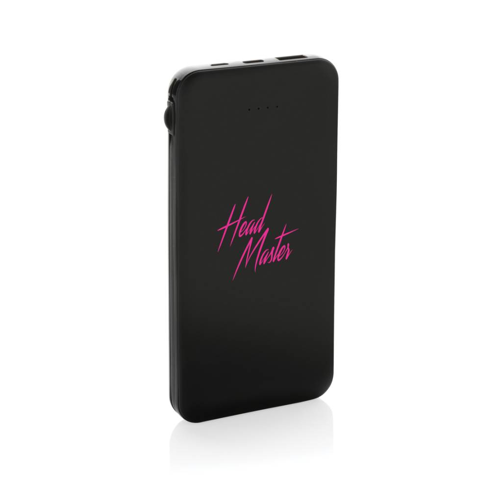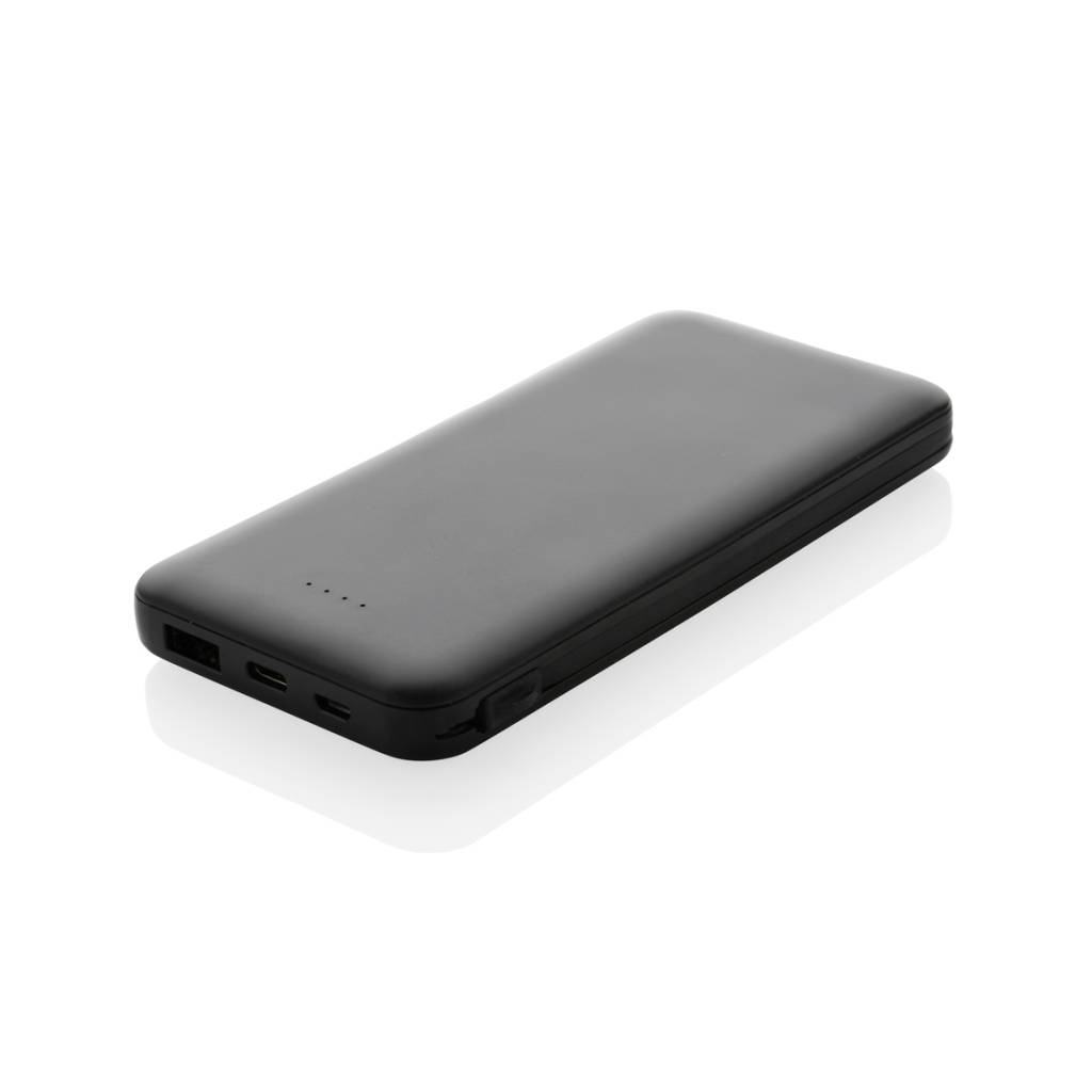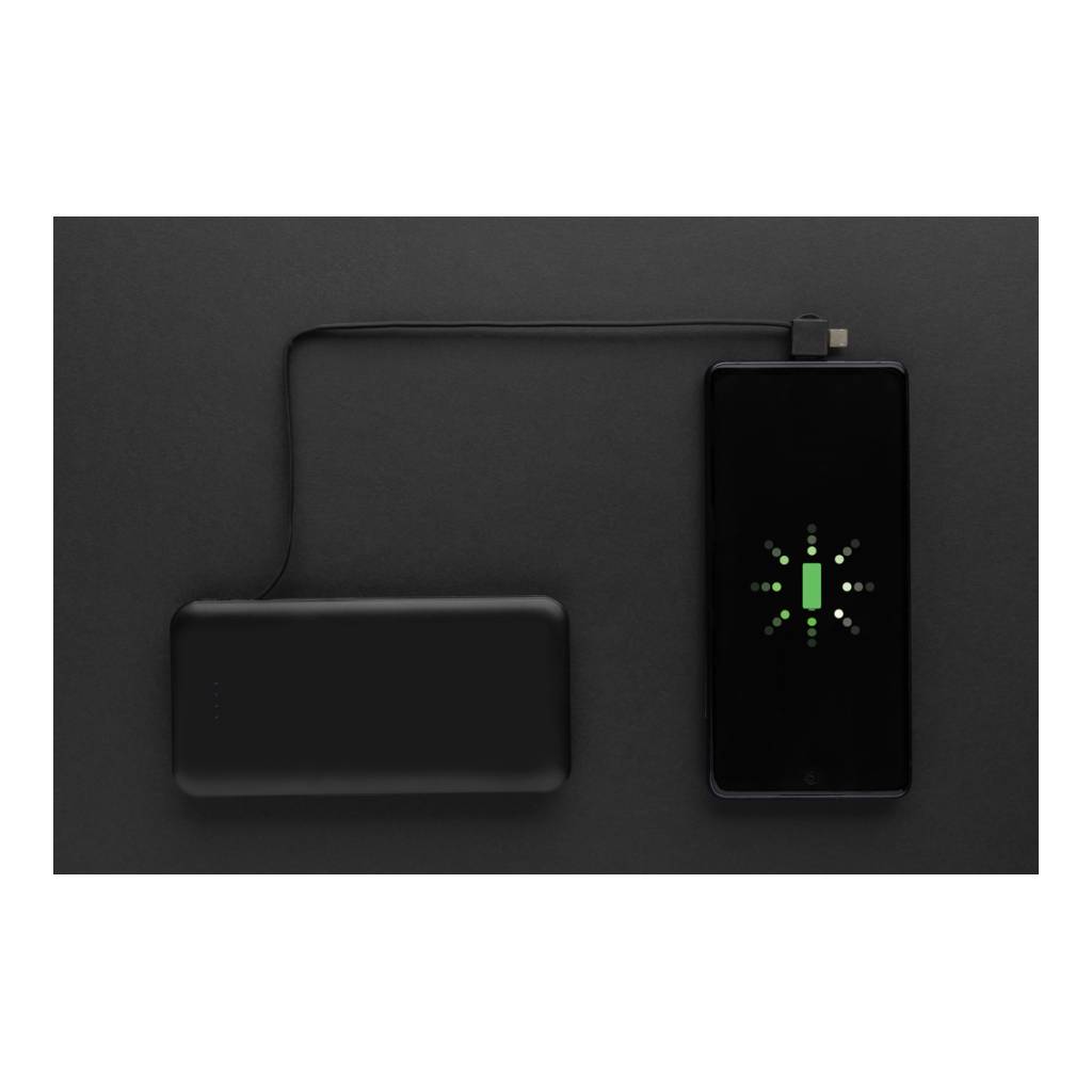 10.000 mAh ravna baterija za napajanje s integriranim kabelima za punjenje s kućištem od reciklirane ABS plastike s RCS certifikatom, kabeli izrađeni od recikliranog TPE s RCS certifikatom. RCS (Recycled Claim Standard) standard je za provjeru recikliranog sadržaja proizvoda u cijelom opskrbnom lancu. Ukupni reciklirani sadržaj: 21% na temelju ukupne težine artikla. Powerbank sadrži dugotrajnu litij-polimersku bateriju razreda A od 10.000 mAh. Indikatori napajanja pokazat će preostalu razinu energije tako da uvijek znate kada ponovno napuniti. Micro USB ulaz 5V/2A; Tip-C ulaz 5V/2,4A; USB izlaz 5V/2A; Izlaz kabla tipa C: 5V2.4A, izlaz kabla IOS: 5V/1A. Predmeti i pribor bez PVC-a. Uključujući kabel za punjenje od recikliranog TPE materijala bez PVC-a tipa C.