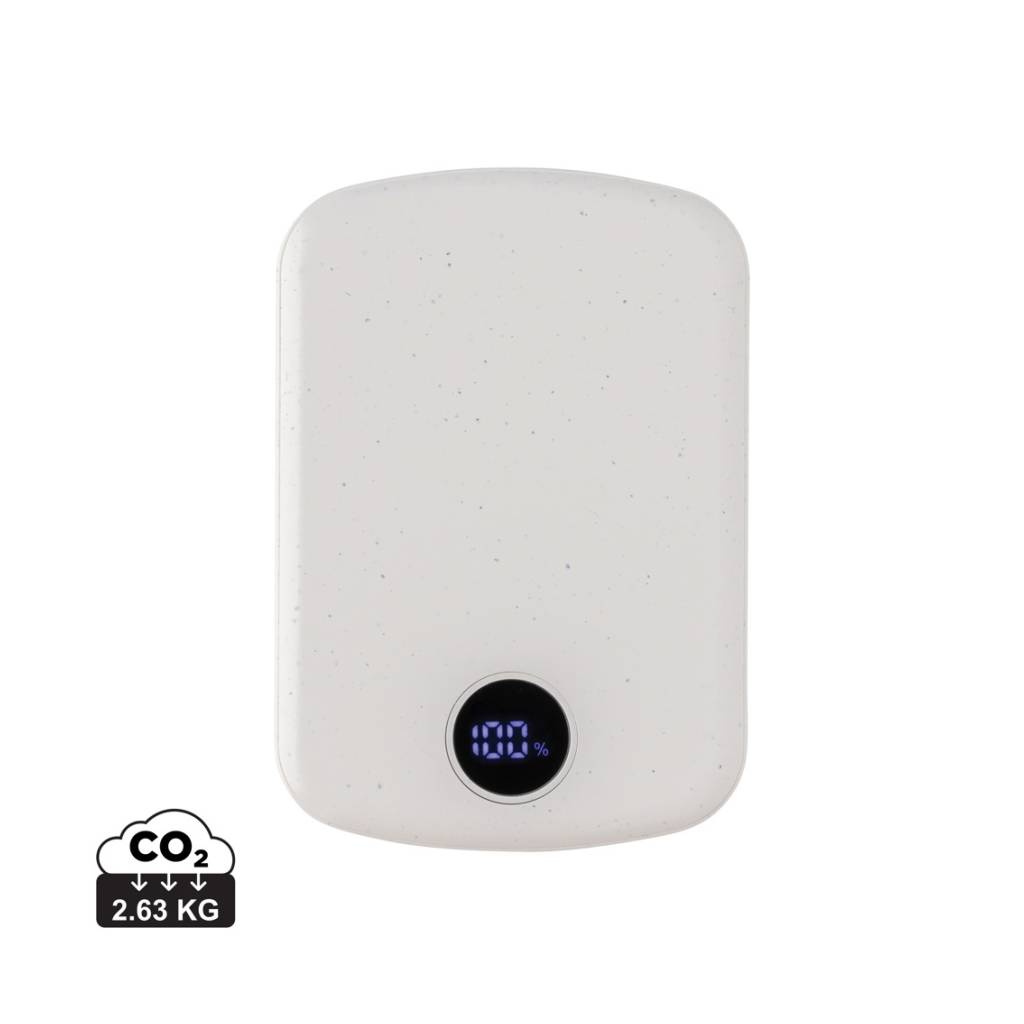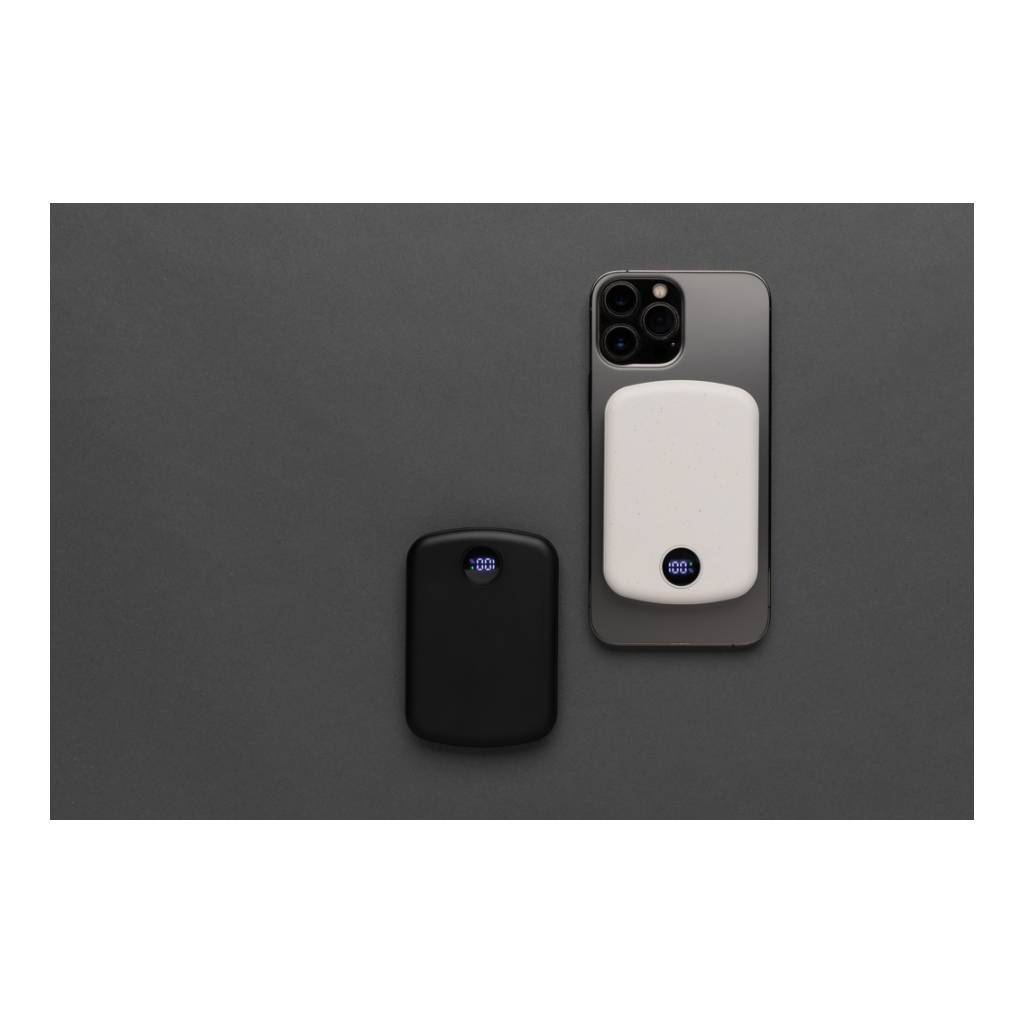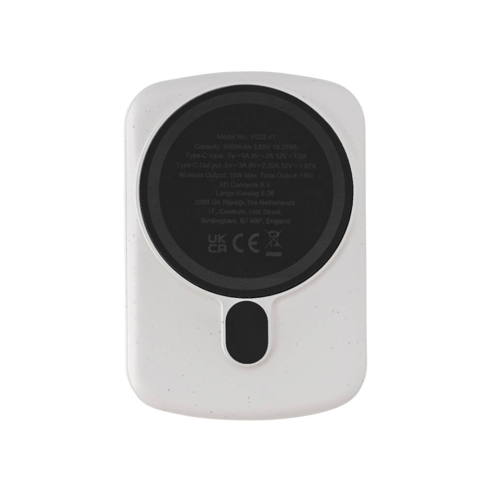Powerbank džepne veličine od 5000 mAh s magnetskim bežičnim punjačem od 15 W s kućištem izrađenim od reciklirane ABS plastike s RCS certifikatom. RCS (Recycled Claim Standard) standard je za provjeru recikliranog sadržaja proizvoda u cijelom opskrbnom lancu. Ukupni reciklirani sadržaj: 21 % na temelju ukupne težine artikla. Powerbank sadrži dugotrajnu litij-polimersku bateriju razreda A od 5.000 mAh. Integrirani digitalni LED zaslon pokazat će preostalu razinu energije tako da uvijek znate kada ponovno napuniti.; Tip-C ulaz 5V/2,4A; Izlaz tipa C: 5V/2A.4A Artikl i dodaci ne sadrže PVC. Uključujući RCS certificirani reciklirani TPE kabel za punjenje. Pakirano u FSC® mix ambalažu. Tip-C ulaz: 5V/3A 9V/2A 12V/1.5A; Izlaz: USB-C izlaz: 5V/2,4A,9V/2,22A,12V/1,67A; Bežična snaga: 15W