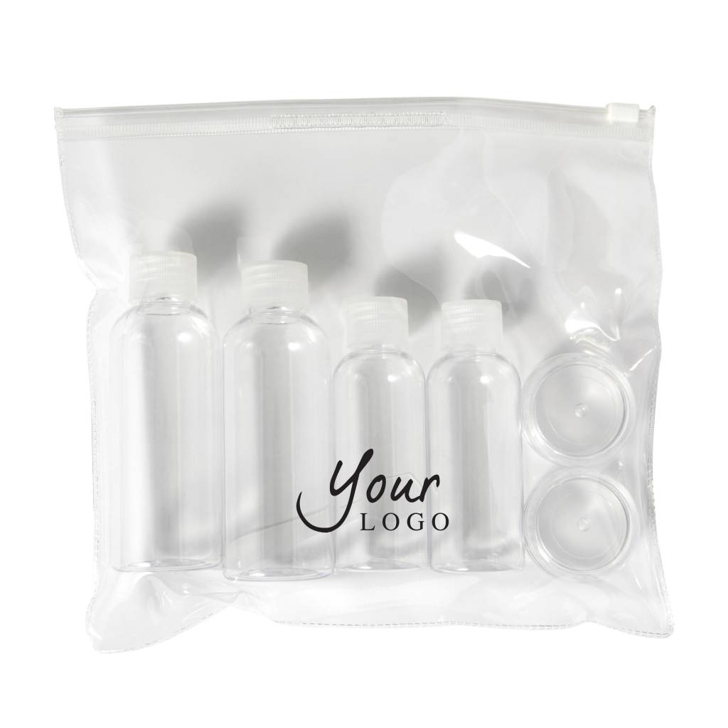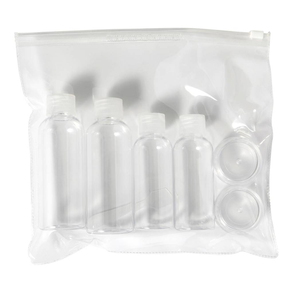 PETG putni set koji uključuje dvije boce od 100 ml, dvije boce od 50 ml, dvije posude od 10 ml i malu lopaticu.