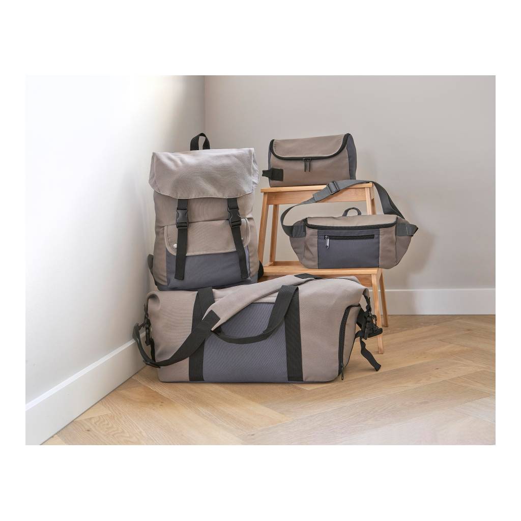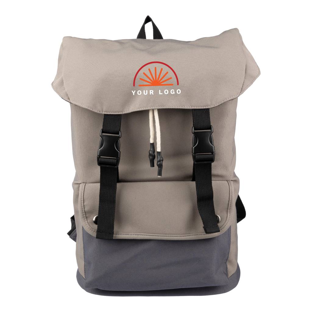 Ruksak od poliestera (600D) s PU (210D) podstavom i dnom i podlogom od PE pjene (8 mm). Veliki pretinac s vezicom s kopčom i torbicom za prijenosno računalo (15 inča). Džep s prednje strane s metalnim gumbima. Podesive naramenice.