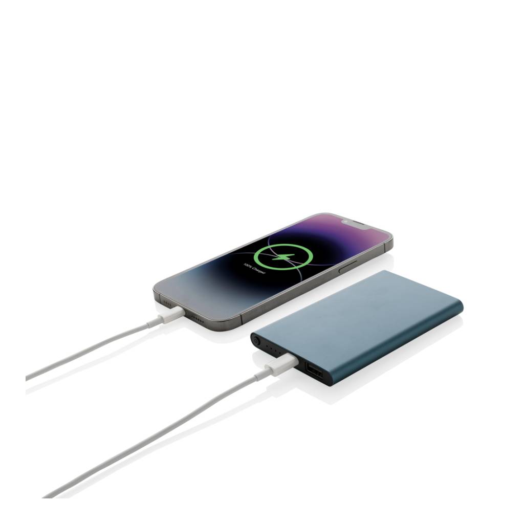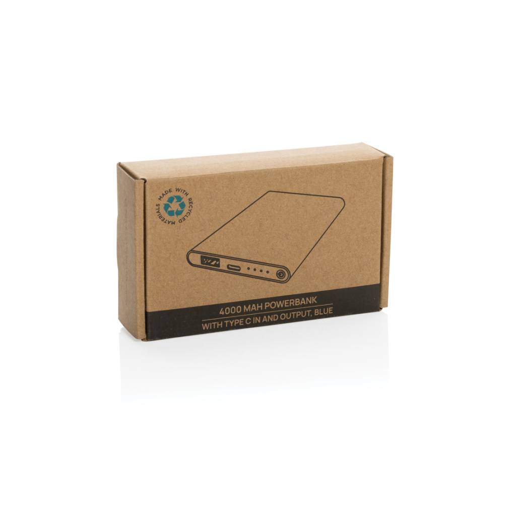 Powerbank ravnog dizajna od 4.000 mAh s kućištem izrađenim od recikliranog aluminija/ABS plastike s RCS certifikatom. RCS (Recycled Claim Standard) standard je za provjeru recikliranog sadržaja proizvoda u cijelom opskrbnom lancu. Ukupni reciklirani sadržaj: 36 % na temelju ukupne težine predmeta. Powerbank podržava i punjenje putem USB-a A kao i tipa C. Powerbank sadrži dugotrajnu litij-polimersku bateriju razreda A od 4.000 mAh. Indikatori napajanja pokazat će preostalu razinu energije tako da uvijek znate kada ponovno napuniti.; Tip-C ulaz 5V/2A; Tip C izlaz: 5V/2A USB A izlaz: 5V/2A. Predmeti i pribor bez PVC-a. Uključujući RCS certificirani reciklirani TPE kabel za punjenje. Pakirano u FSC® mix ambalažu.