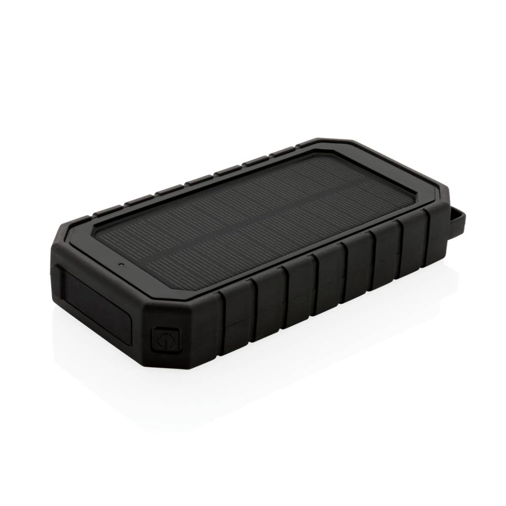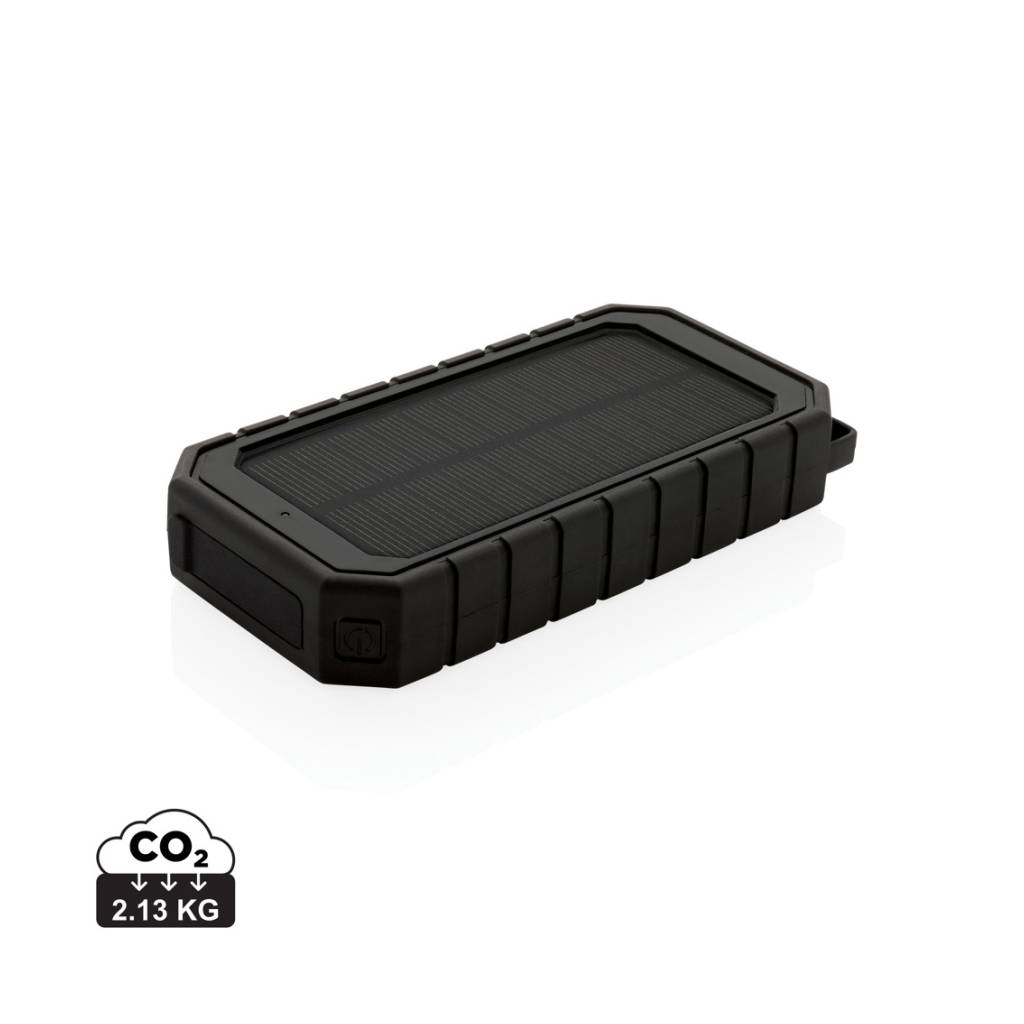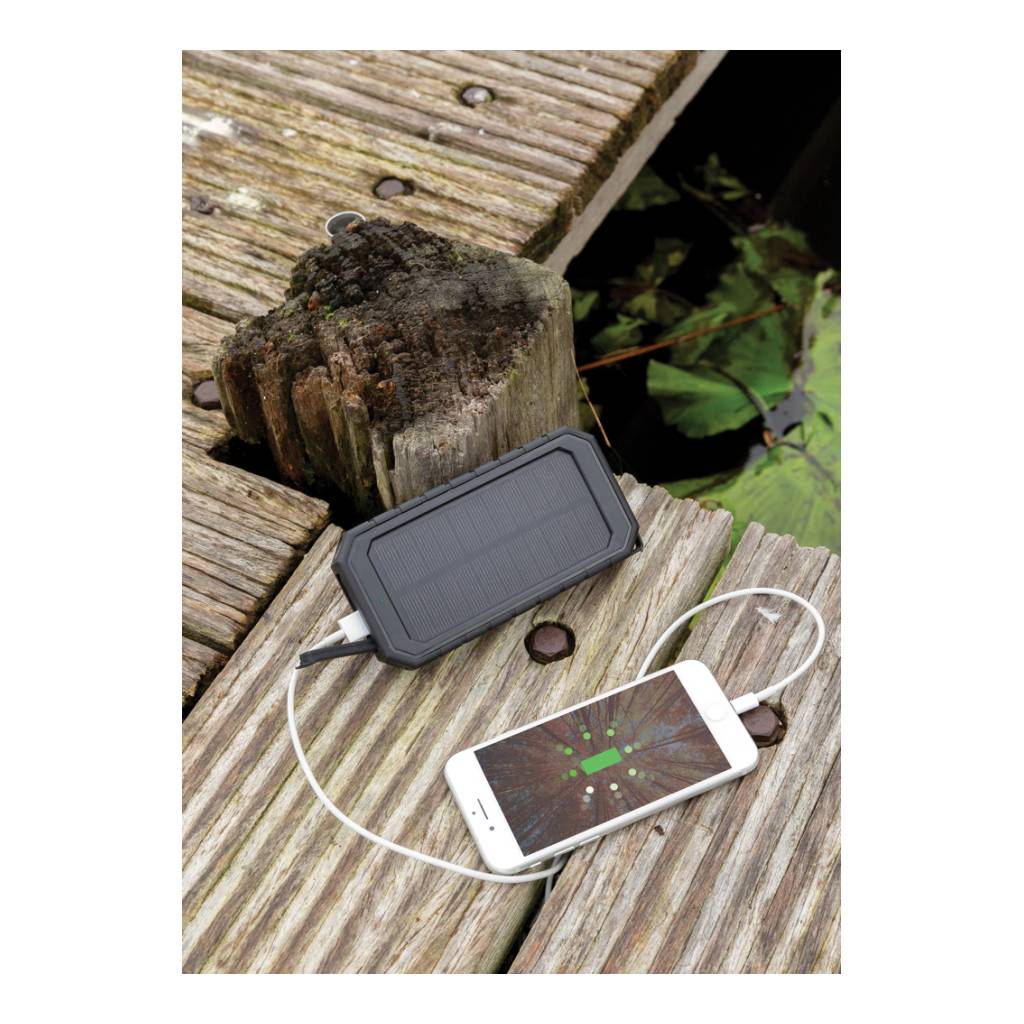 Brza solarna baterija za bežično punjenje od 10.000 mah i 10 W izrađena od recikliranog ABS-a i TPE-a s certifikatom RCS (Recycled Claim Standard). Ukupni reciklirani sadržaj: 30% na temelju ukupne težine predmeta. RCS certifikat osigurava potpuno certificirani opskrbni lanac recikliranih materijala. Powerbank podržava punjenje putem kabela (tip C i USB) kao i putem bežičnog brzog punjača od 10 W. Bežično punjenje kompatibilno sa svim uređajima koji podržavaju QI kao što su najnovija generacija Androida, iPhone 8 i noviji. Ima solarnu ploču zajedno sa svjetiljkom i karabinerom za pričvršćivanje na bilo koju torbu. IPX5 vodootporan. S indikatorom preostale baterije. Uključujući tip C kabel za punjenje izrađen od GRS certificiranog recikliranog TPE-a. Pakirano u FSC® mix kraft kutiju. USB izlaz: 5V/2.4A; Tip C Izlaz: 5V/2.4A. Stavka i dodaci 100% Bez PVC-a