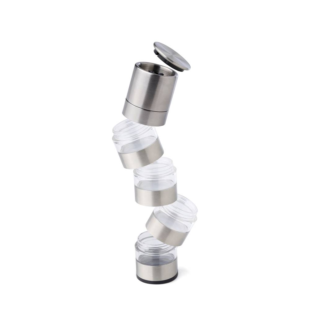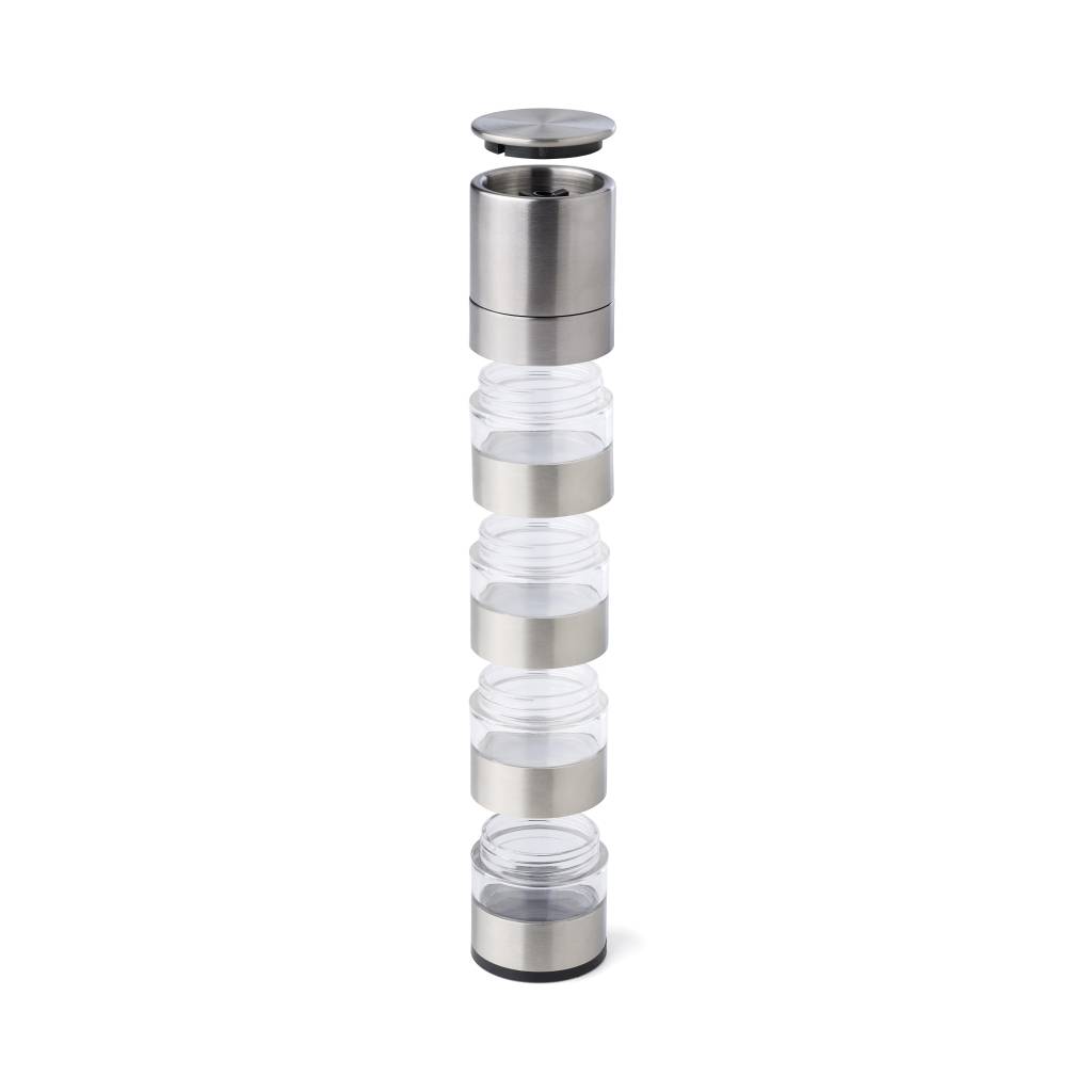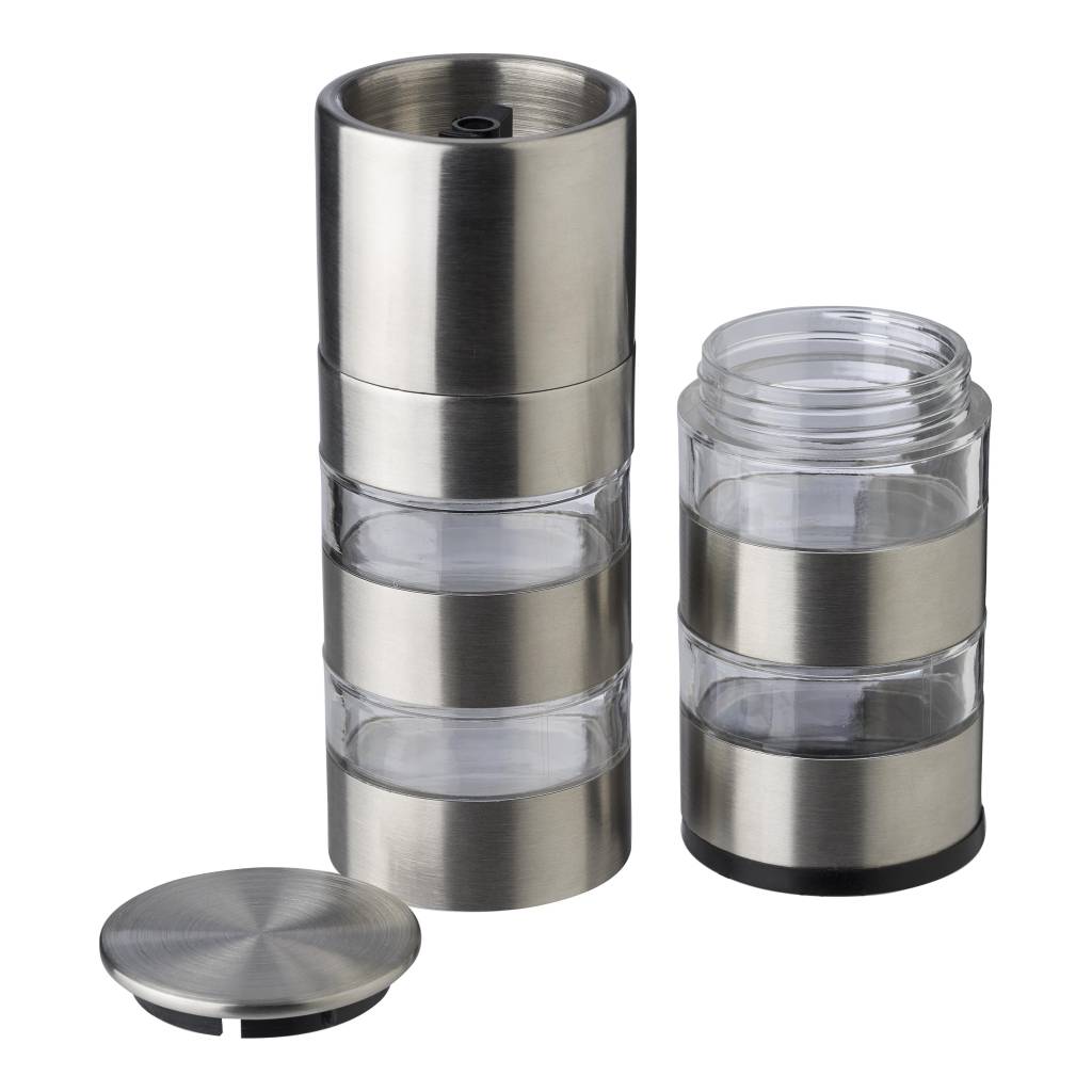Mlinac za začine od nehrđajućeg čelika s 4 odjeljka i keramičkim mlinom. Pojedinačno pakirano u smeđu kartonsku kutiju.