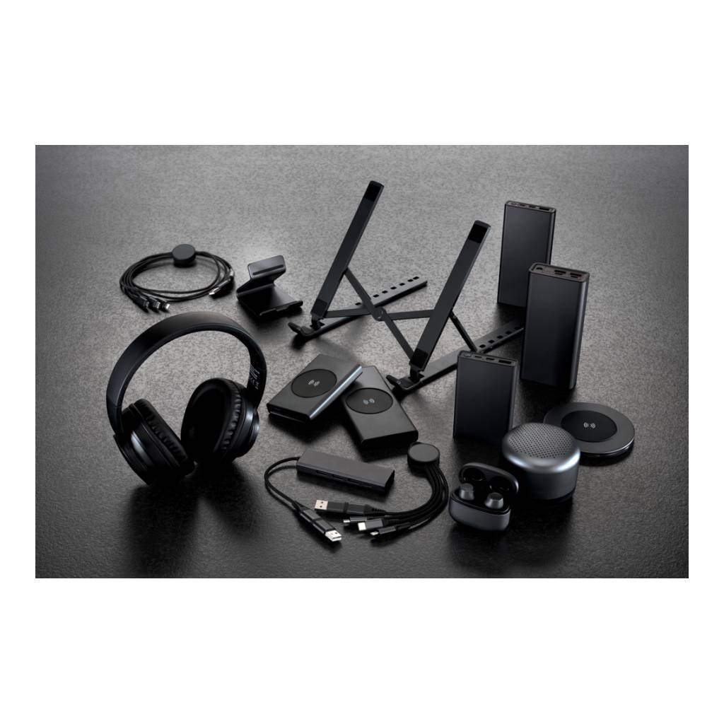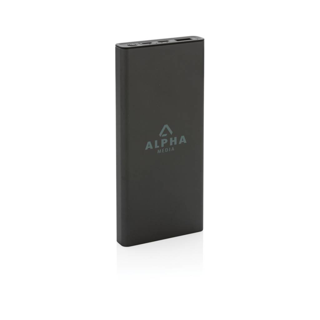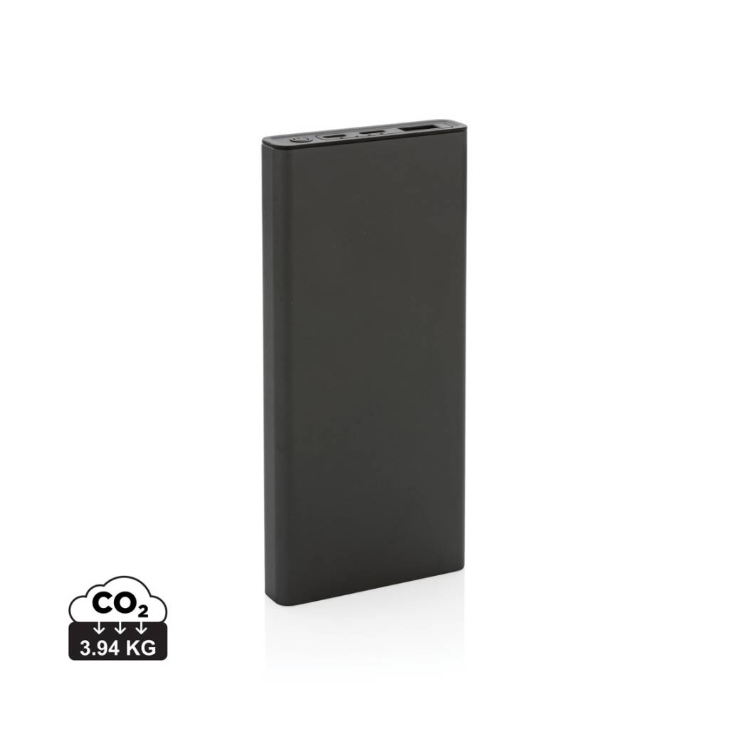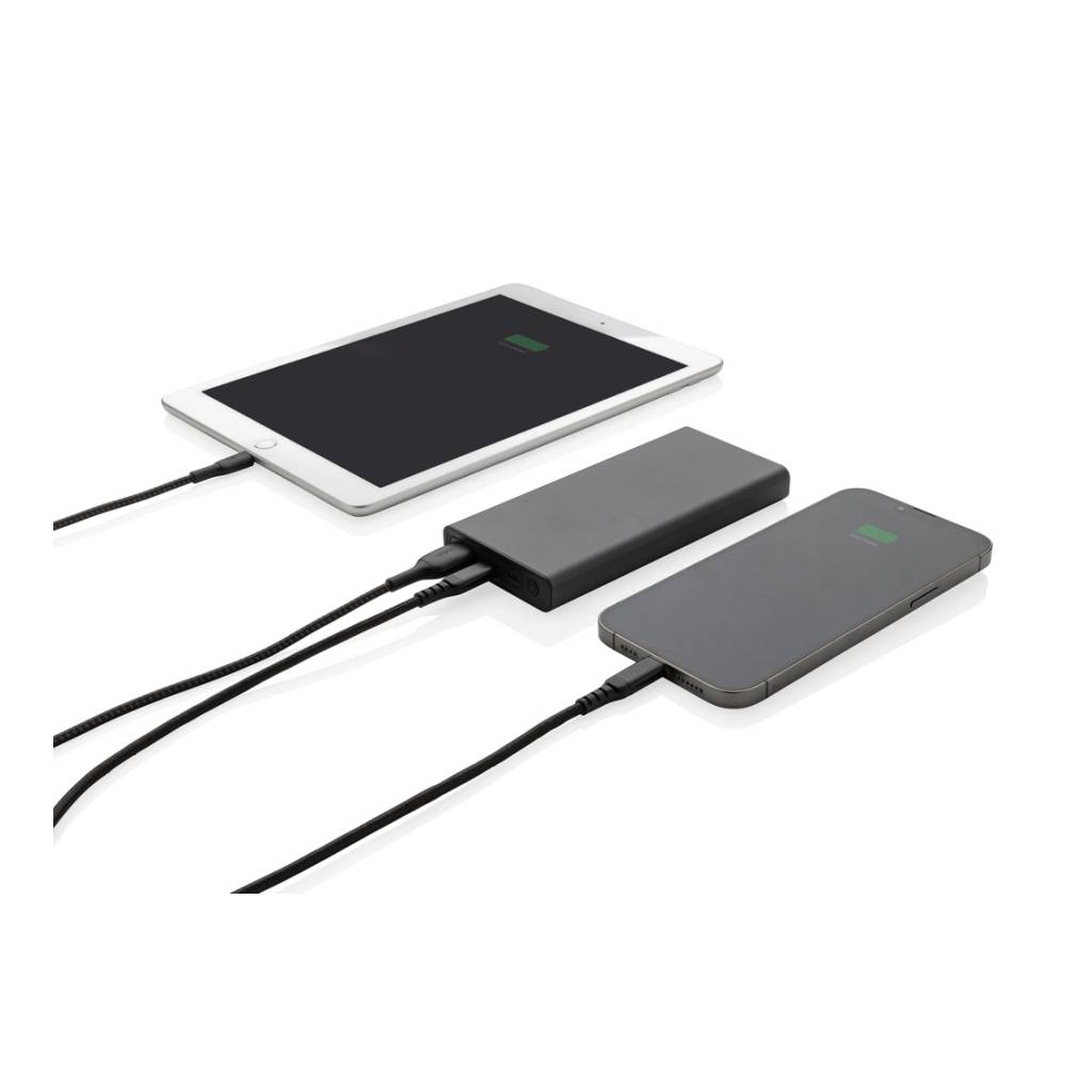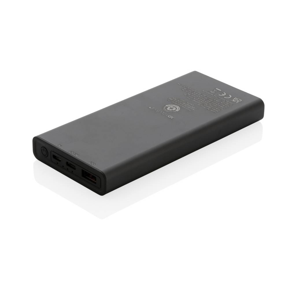 Powerbank s ultrabrzim punjenjem izrađen od recikliranog aluminija i ABS-a s certifikatom RCS (Recycled Claim Standard). Ukupni reciklirani sadržaj: 27% na temelju ukupne težine predmeta. RCS certifikat osigurava potpuno certificirani opskrbni lanac recikliranih materijala. Aluminij ne gubi svoje karakteristike u procesu recikliranja i može se neograničeno reciklirati. Powerbank sadrži dugotrajnu litij-polimersku bateriju razreda A od 10.000 mAh. C izlazni priključak podržava brzo punjenje do 18 W i također brzo ponovno punjenje unutar 3 sata. Indikatori napajanja pokazat će preostalu razinu energije tako da uvijek znate kada ponovno napuniti. Stavka i pribor 100% bez PVC-a. Uključujući tip C kabel za punjenje izrađen od recikliranog aluminija s RCS certifikatom, TPE i PET. Pakirano u FSC® mix ambalažu. USB izlaz 5/3A, 9V/2A. 12V/1,5A. Tip C izlaz: 5V/3A, 9V/2A, 12V/1.5A. Tip C ulaz: 5V/3A, 9V/2A, 12V/1.5A. Micro USB ulaz: 5V/2A, 9V/2A, 12V/1.5A.
