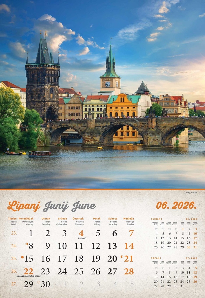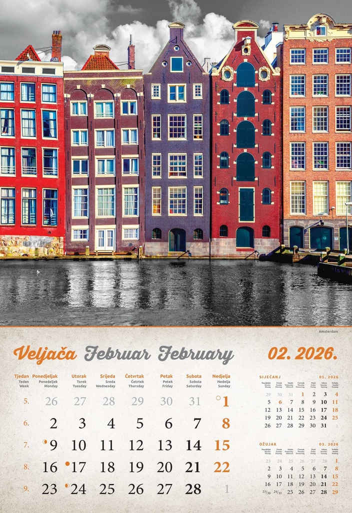 Opseg: 13 listova / Dimenzije: 33 x 55 cm / Prostor za ispis: 33 x 7 cm / Opis: Tromjesečni kalendar, vrećica / Jezici: HR, SI, GB / Vrsta papira: KD 135 g/m² listovi, 350 g/m² baza / Uvez: Spiralni / Pakiranje: 40 kom